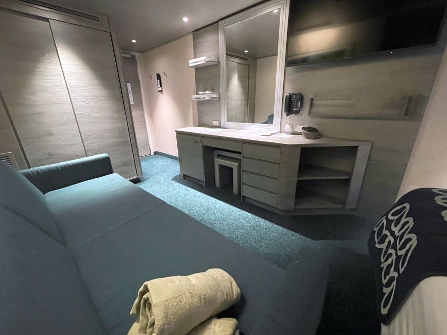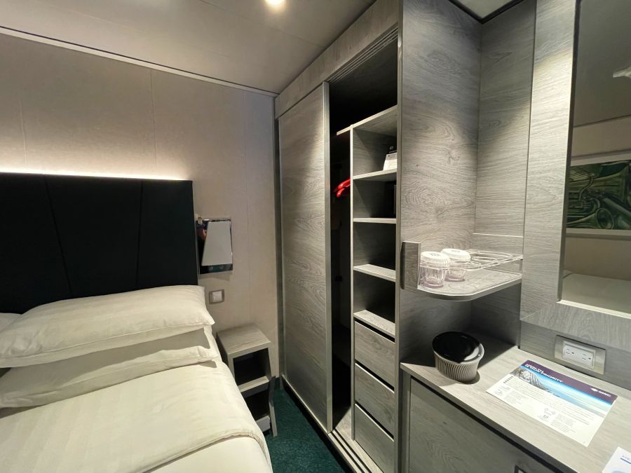 De MSC Virtuosa heeft 15 binnenhutten van 12m2 die bestemd zijn voor 1 cruisereiziger. Ze worden Studio’s genoemd. De 12 vierkante meter is zeer efficiënt ingericht in deze hut. Het bed van 1,40 m breed staat tegen een lange kant aan. Het bureau heeft alle faciliteiten als een binnenhut, met voldoende stopcontacten. De badkamer heeft het standaardformaat.