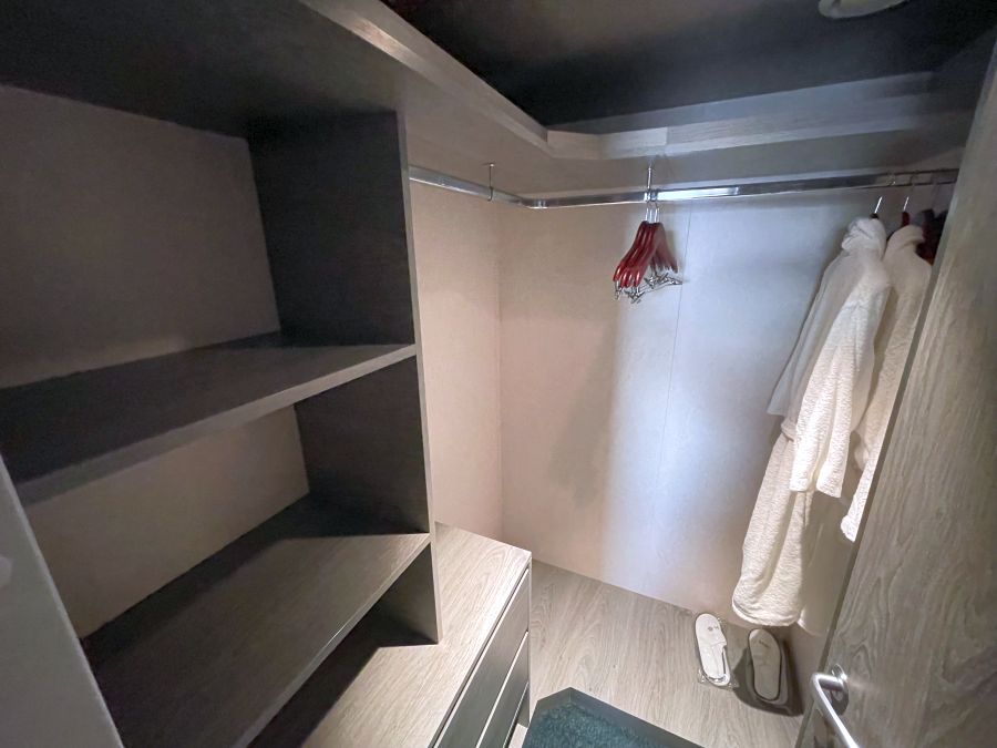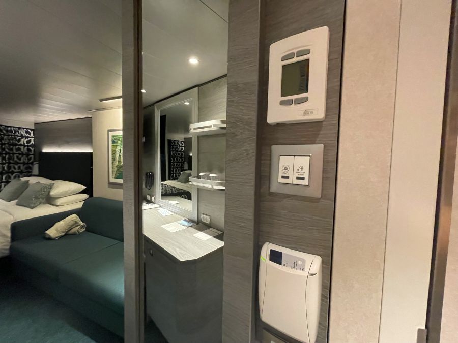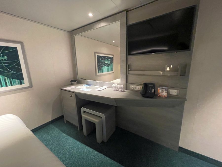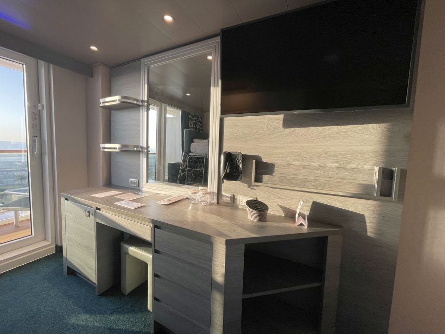 Bij dit bureau bevinden zich twee Europese – en twee Amerikaanse stopcontacten en een usb-poort, net even wat meer dan de binnenhutten. De kledingkast heeft een hanggedeelte en een aantal planken, twee lades en een kluisje. De opbergruimte is dus beperkt tot deze kast. In de badkamer zijn nog wel plankjes om je toiletspulletjes neer te leggen. Het balkon bij de reguliere balkon hut is niet heel diep. Tip! Dek 8 heeft wél een aantal diepe balkons.