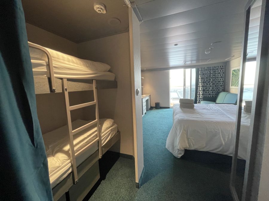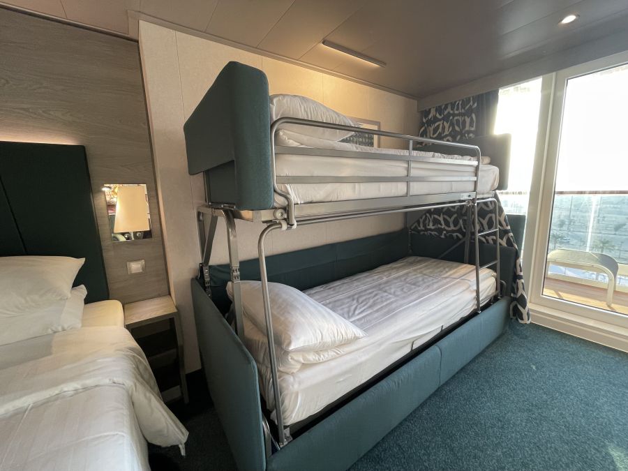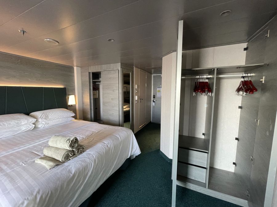 Voor nog grotere families zijn er ook een aantal suites met een tussendeur beschikbaar zodat je 2 van dit soort hutten kunt boeken voor nog meer ruimte. Hieronder zie je een dergelijke suite, gelegen aan de achterkant van het schip.