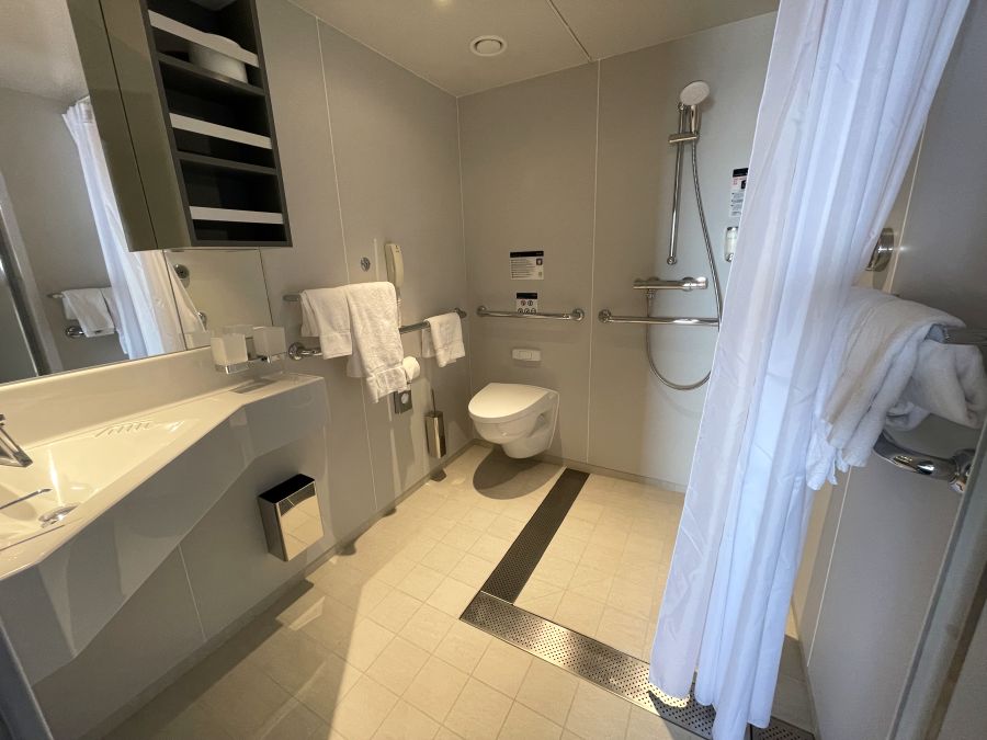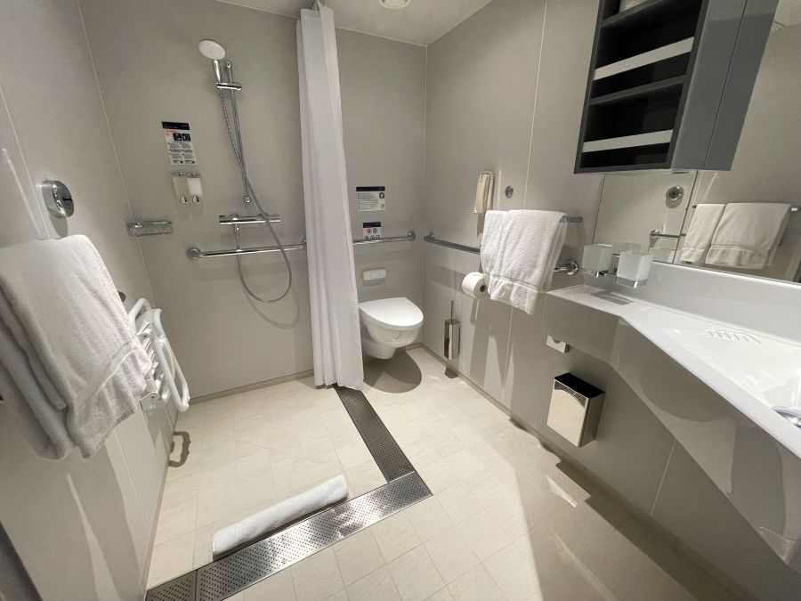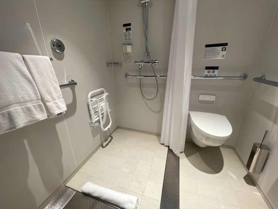 De balkonhut voor mindervaliden (32 stuks) is uiteraard ruim opgezet met een eveneens grote badkamer. Om het balkon te bereiken met een rolstoel is een plank beschikbaar. Het balkon die wij bezocht hebben, was enorm! Daar kan je gemakkelijk met je rolstoel op en ook nog ruimte hebben om te draaien. De badkamer is uiteraard aangepast. De badkamerdeur / kamerdeur gaan overigens niet automatisch open met een druk op de knop. De kledingkast heeft heeft een extra rek, lager, voor kledinghangers.