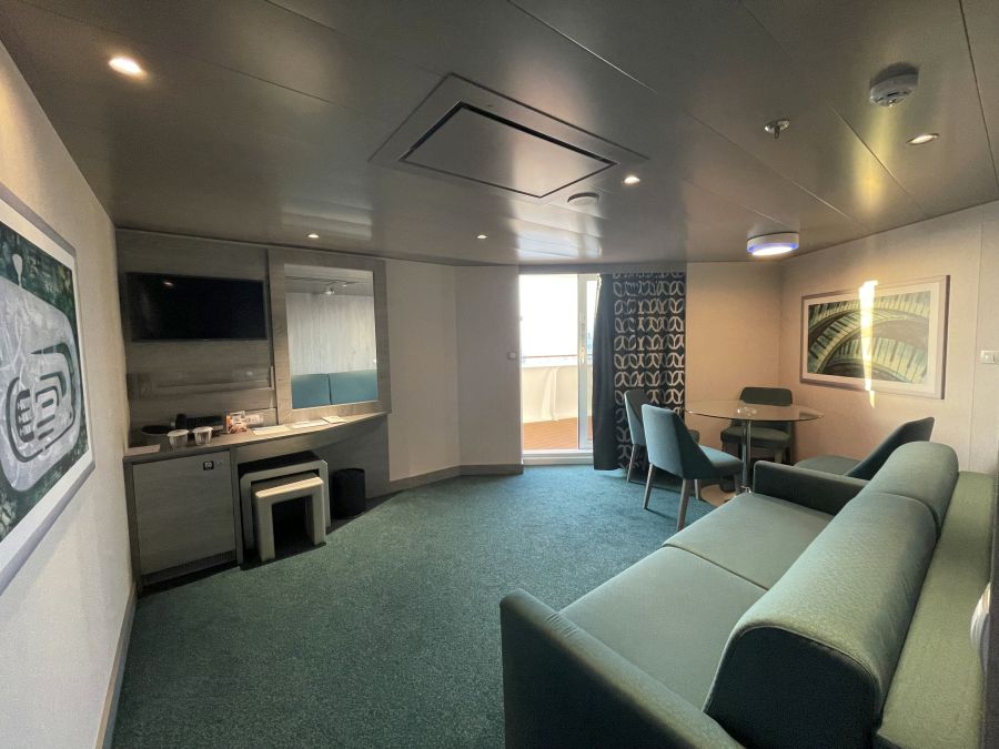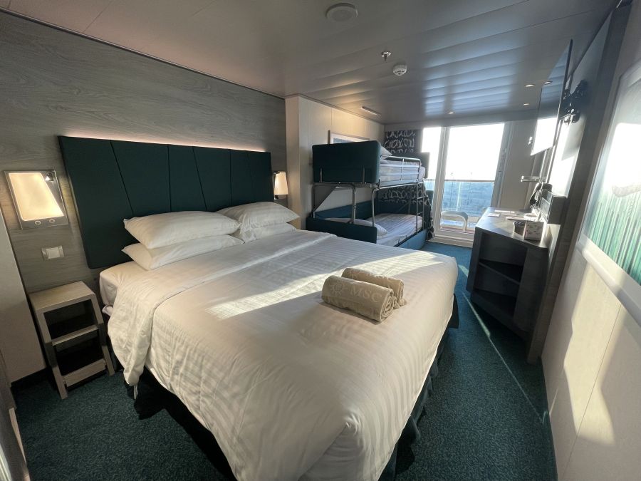 Er zijn diverse suites op de MSC Virtuosa, ofwel gelegen op een hoek – altijd met whirlpool – of suites die wat breder zijn dan een balkonhut. De MSC Virtuosa heeft 24 van dit soort brede suites. Zo kunnen maximaal 6 personen in één suite. Bij de ingang van de hut is een vast stapelbed voor 2 gelegen. Deze kan je met een gordijn afschermen. Daarnaast is er uiteraard een bedbank en het reguliere bed.