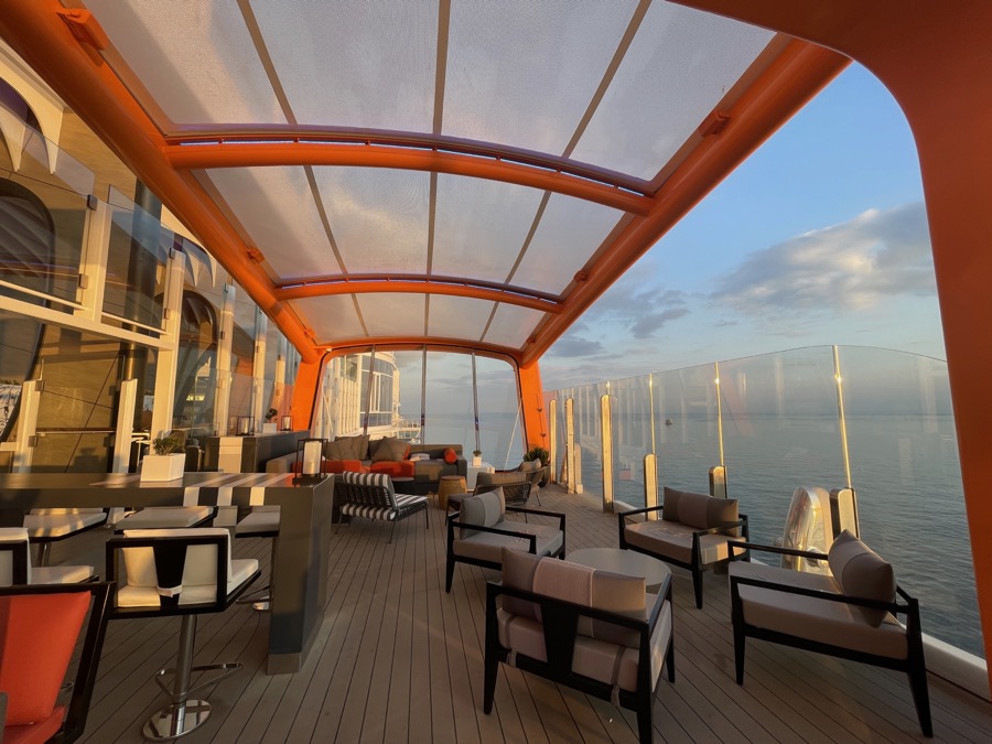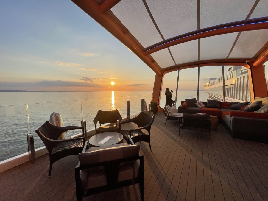 Het niet te missen Magic Carpet is met stip de meest hippe plek om een drankje te doen bij zonsondergang. Met uitzicht op de zijkant van het schip, trakteer je iedereen op een drankje met geweldig uitzicht.