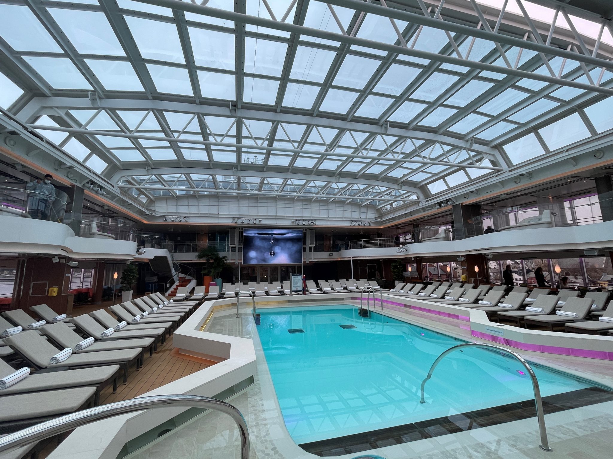 Een zeedag als tweede dag bevalt me altijd erg goed, je kunt dan rustig het schip je eigen maken. Dat hebben we uiteraard dus gedaan. Na een ietwat druk ontbijt in het buffetrestaurant, aten wij ons ontbijtje op bij het Lido zwembad. Je hebt daar vrijwel altijd een rustigere tafel en ook de service van koffie en water aan tafel door de obers. Wat overigens opviel is dat in het buffetrestaurant vrijwel alle voedselitems worden aangegeven door de medewerkers. Zeer hygiënisch en fijn in deze tijd. Dit zou niet alleen de eerste twee dagen zijn, maar gedurende de hele cruise.