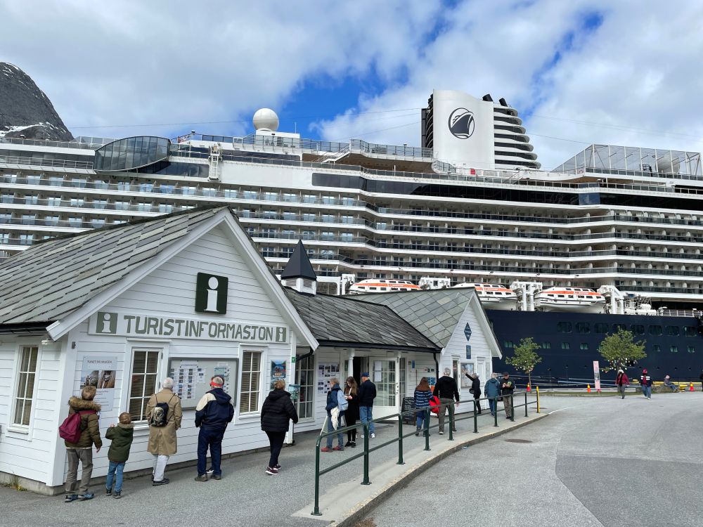 Het stadje bereiken we gemakkelijk doordat we met de Rotterdam aan een kade liggen. We gaan door de gangway, mét mondkapje op, en daarna zelfstandig op pad. Al lopend zien we een toeristisch ‘Troll’ treintje bij het VVV kantoor (150 NOK per volwassene) waar vrijwel tot 13:00 uur ’s middags de rijen staan. Mijn advies is om vooraf te reserveren (https://bit.ly/3sriWvu). Het ritje gaat naar oude prehistorische grafheuvels, een kerkje uit 1309 en eventueel een houtzagerij (entree 20 NOK).