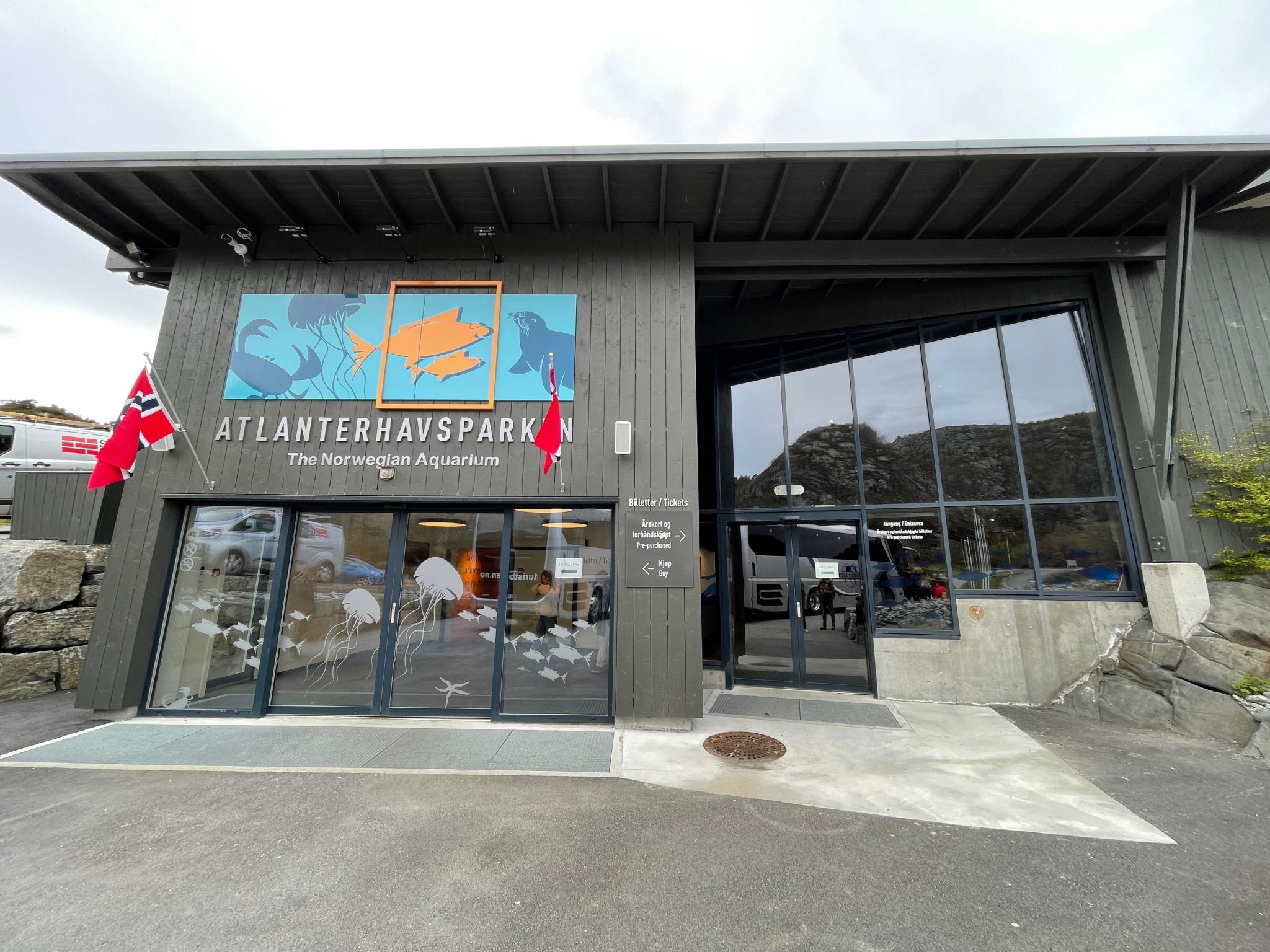Vannacht hadden we overigens wel wat wind op onze route van Eidfjord naar Alesund. Nu was het grijs, maar wel droog! In de middag gingen we op excursie naar nabijgelegen Aquarium/Oceaanpark en een korte rondtour door de stad, geboekt op het schip. Daarvoor moesten we rond 12:00 verzamelen in het theater waarna we wachtten tot onze groep geroepen werd om via de zijkant van het theater naar de administratie te gaan. Middels het scannen van de excursietickets op de Navigator app en het krijgen van een sticker, waren we klaar om daarna direct naar de gangway te gaan. De Rotterdam ligt in Alesund direct aan een lange kade, waarbij je binnen 5 minuten in het centrum staat.