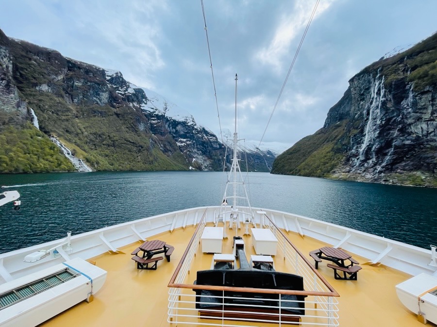 Het vertrek werd overigens iets uitgesteld, van 5 uur naar 6 uur omdat het schip dat voor ons lag, de Iona, voorrang kreeg. Het maakte voor ons niet uit vertelde kapitein Bas van Dreumel; onze volgende bestemming Geiranger lag dichtbij. Met een erewater vertrokken wij om 6 uur. Opvallend was dat we die avond niet direct naar Geiranger gingen, maar toch nog even de zee op voor ‘maritieme operaties’, ofwel ballasttanks vullen met zeewater en water innemen voor het dagelijks gebruik. We hadden wel enorme pech op zee; redelijke golfslag en een wind die niet meezat. We sliepen dus onrustig in. Dat is dus ook onderdeel van een Noorse Fjordencruise 😉