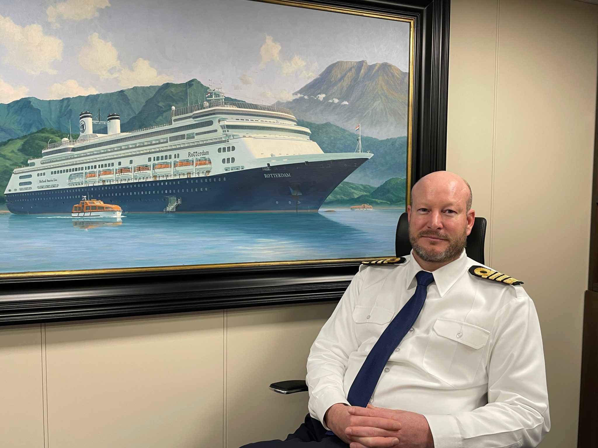 Tijdens de allereerste Noorse Fjordencruise van de Rotterdam mag ik tijdens de laatste zeedag in gesprek met Bas van Dreumel, kapitein van de nieuwe Rotterdam. Met op de achtergrond het schilderij van de Rotterdam 6, praten we over deze cruise en zijn loopbaan.