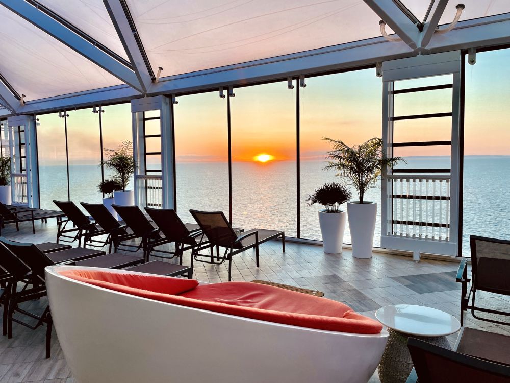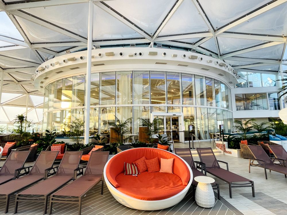 Er is een zonnedek, dat uitgebreider is dan op de andere schepen, met een dompelbad, een bar, voldoende ligstoelen (o.a. in het water) en zithoekjes. Verder vind je er het privé-restaurant Coastal Kitchen en de Suite Lounge. In dit gebied liggen ook de meest luxueuze suites waaronder de Royal Loft Suite en de Ultimate Family Suite. Deze laatste was nog nooit zo groot en biedt plek aan familie van 10 personen. Klik hier voor een overzicht met foto’s van alle verschillende suites.