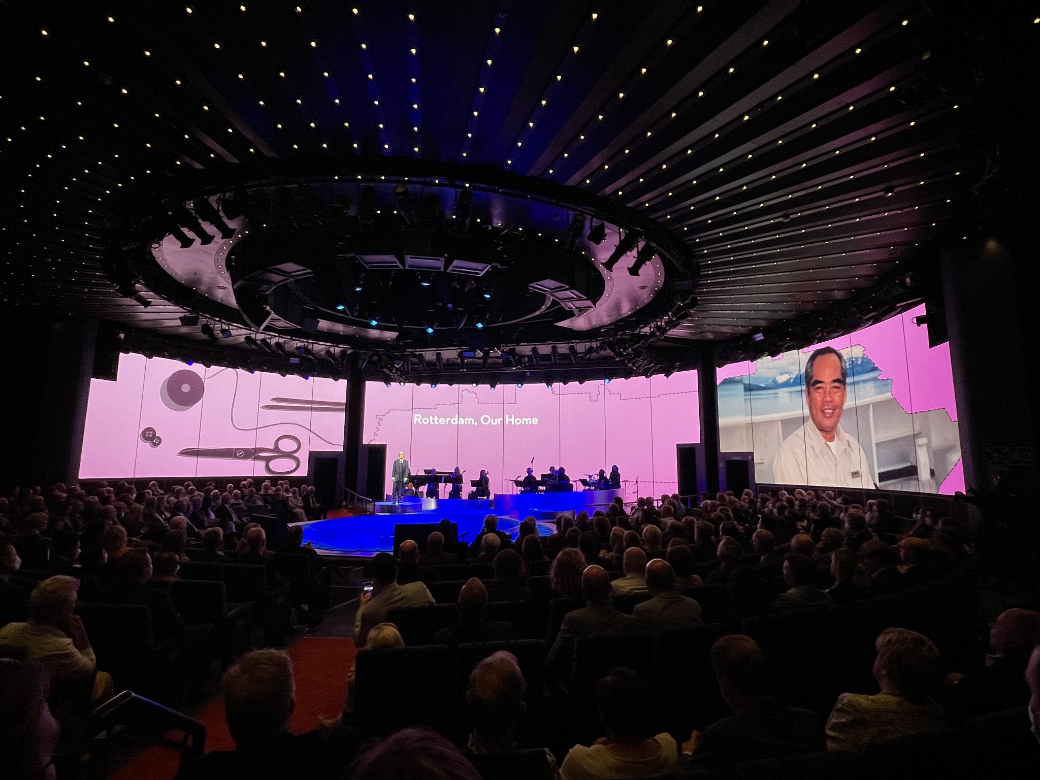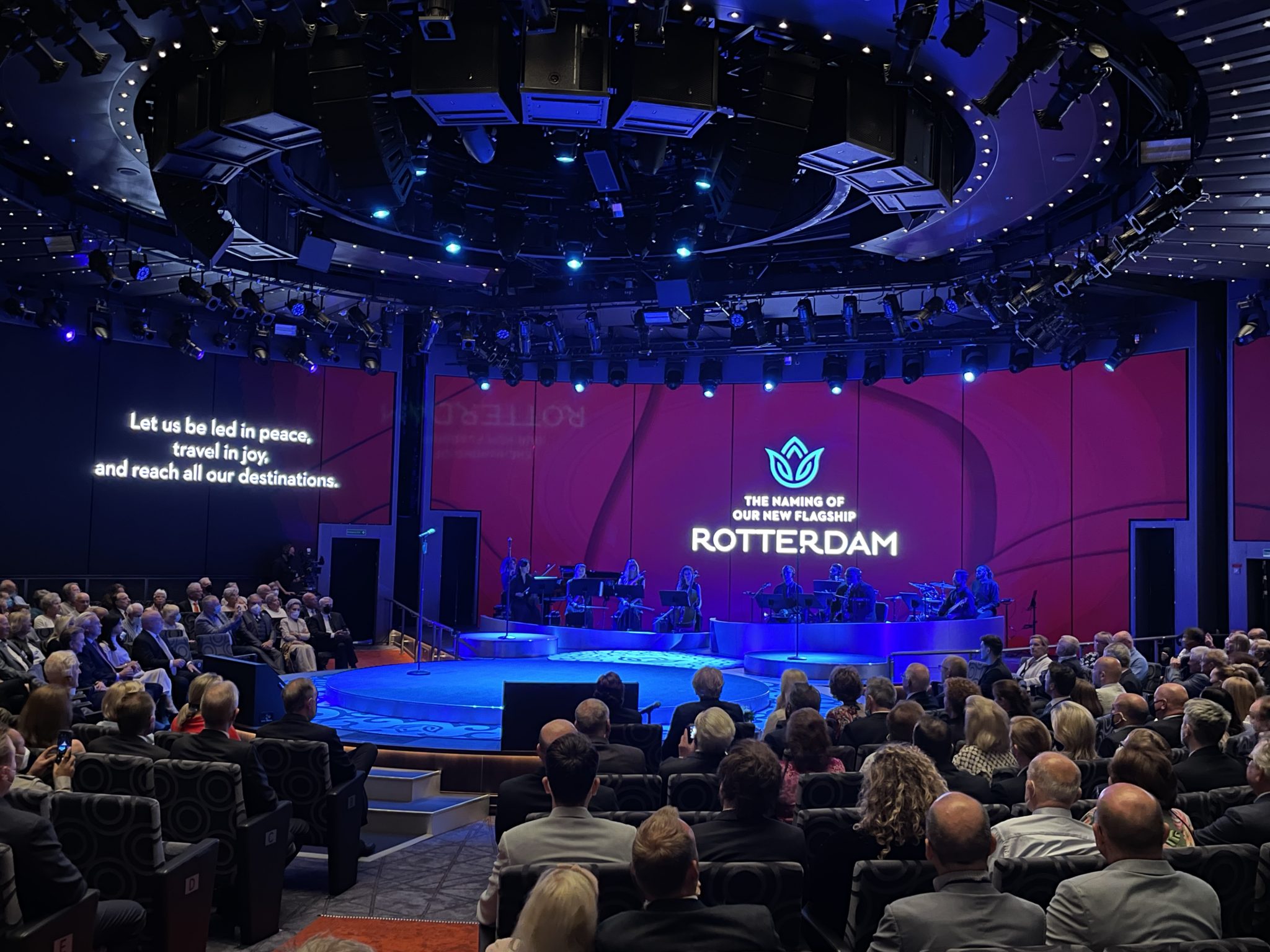 In het World Stage vond de doopceremonie plaats met tal van genodigden en vaste gasten van de rederij, de 4 en 5 sterren Mariners, van de Rotterdam die meevaren.