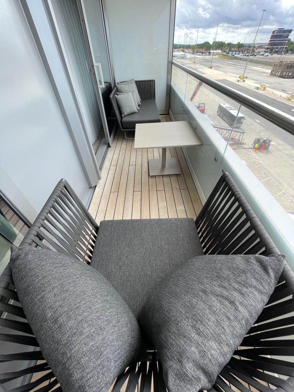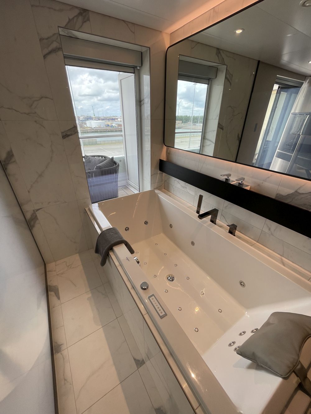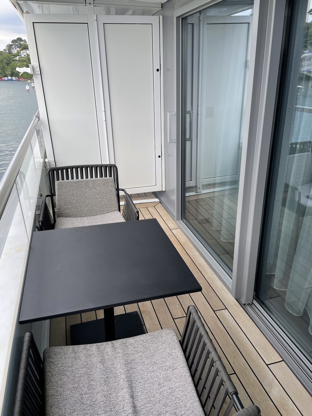 - Balkon, te bereiken via schuifdeuren, met uiteraard een top merk verrekijker om te zien wat er in de verte gebeurt. Naast gordijnen is er ook een automatisch bedienbaar verduisterend scherm. Deze laatste zijn handig als het schip vaart in gebieden waar de zon in gedeeltes van het jaar nauwelijks ondergaat.