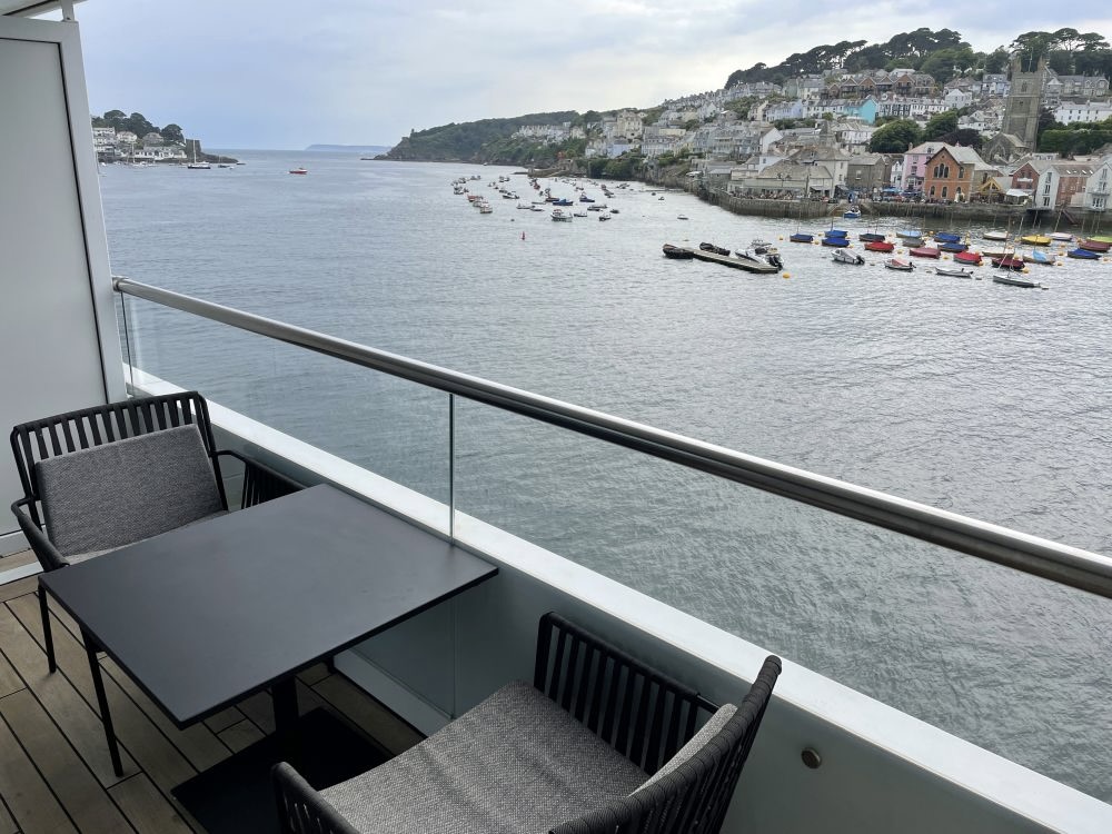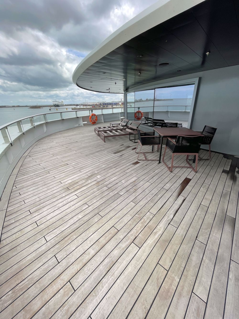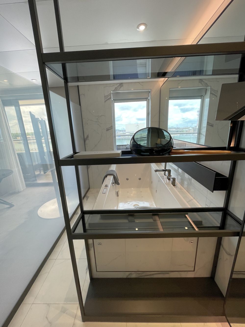 - Balkon, te bereiken via schuifdeuren, met uiteraard een top merk verrekijker om te zien wat er in de verte gebeurt. Naast gordijnen is er ook een automatisch bedienbaar verduisterend scherm. Deze laatste zijn handig als het schip vaart in gebieden waar de zon in gedeeltes van het jaar nauwelijks ondergaat.