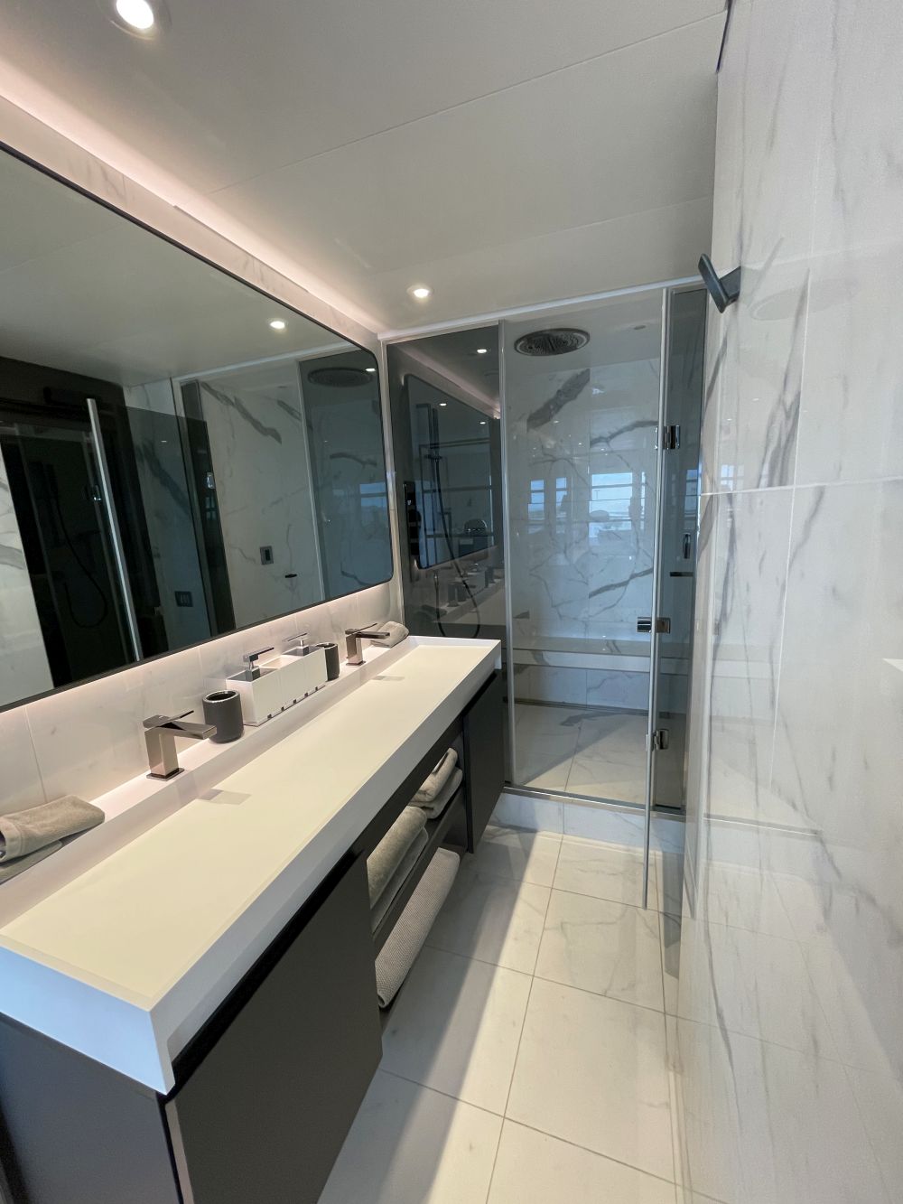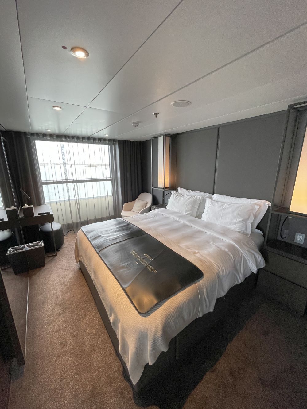 Marco verbleef tijdens zijn verblijf in een Grand Deluxe Verandah Suite op dek 6 (nummer 607 om precies te zijn). Dit was een riante suite van 38-40 m2, waarvan er 24 zijn op dek 5, 6, 7 en 8. Deze liggen in het midden en aan de voorkant van het schip. Zoals de naam al zegt zijn deze suites, met badkamer, kingsize bed en zitgedeelte, net een slag groter dan de Verandah en Deluxe Verandah Suites. De balkons, uitgerust met een tafel en 2 stoelen, zijn met 3 m2 wel van dezelfde formaat.