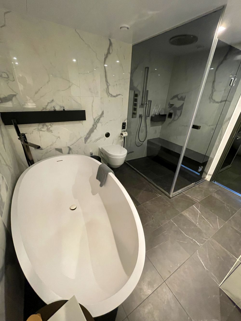 Naast de extra leefruimte is het belangrijkste verschil met de voorgaande categorie suite de walk-in closet. Deze ligt bij binnenkomst tegenover de badkamer.