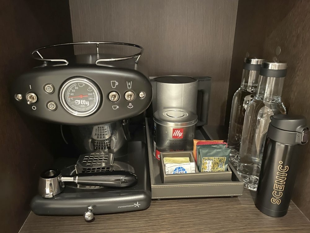 - Minibar met drankjes naar je keuze (ook wijn, champagne, sterke drank) die dagelijks wordt bijgevuld, specialiteiten thee en Illy koffie. Verder staan er 2 flessen water waarmee je je luxe waterfles dagelijks kunt vullen. Deze is bestemd om plastic waterflesje te minimaliseren. De fles kan je meenemen op excursie en uiteindelijk ook naar huis.