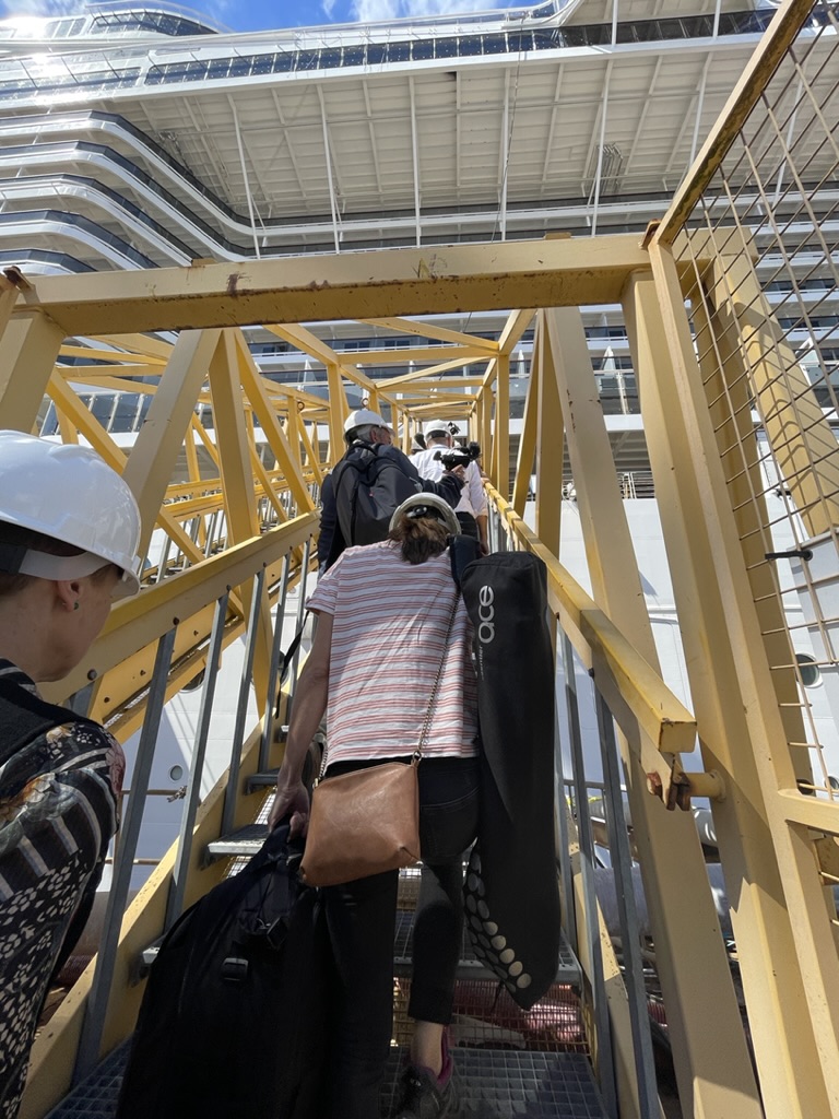 Via bouwtrappen bereikte ik, net zoals meer dan 2000 scheepswerf medewerkers, de MSC World Europa. De scheepswerf medewerkers worden overigens aangevuld met specialisten uit diverse disciplines die een kleinere of grotere taak mogen uitvoeren bij de installatie en inrichting. Gewapend met een MSC helm, veiligheid voor alles!, werden we rondgeleid door het schip.