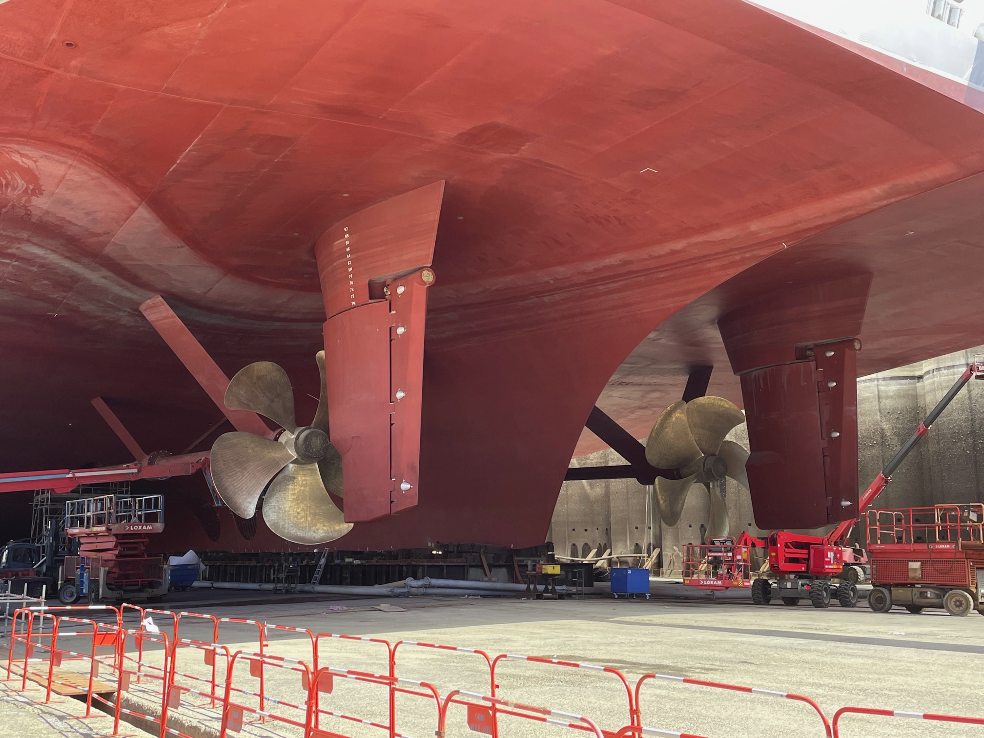 Tijdens mijn bezoek aan het schip, lag deze in een droogdok. Wel heeft het schip half juni al een proefvaart gemaakt, maar keerde daarna terug naar het dok omdat de inrichting verder voltooid moet worden.