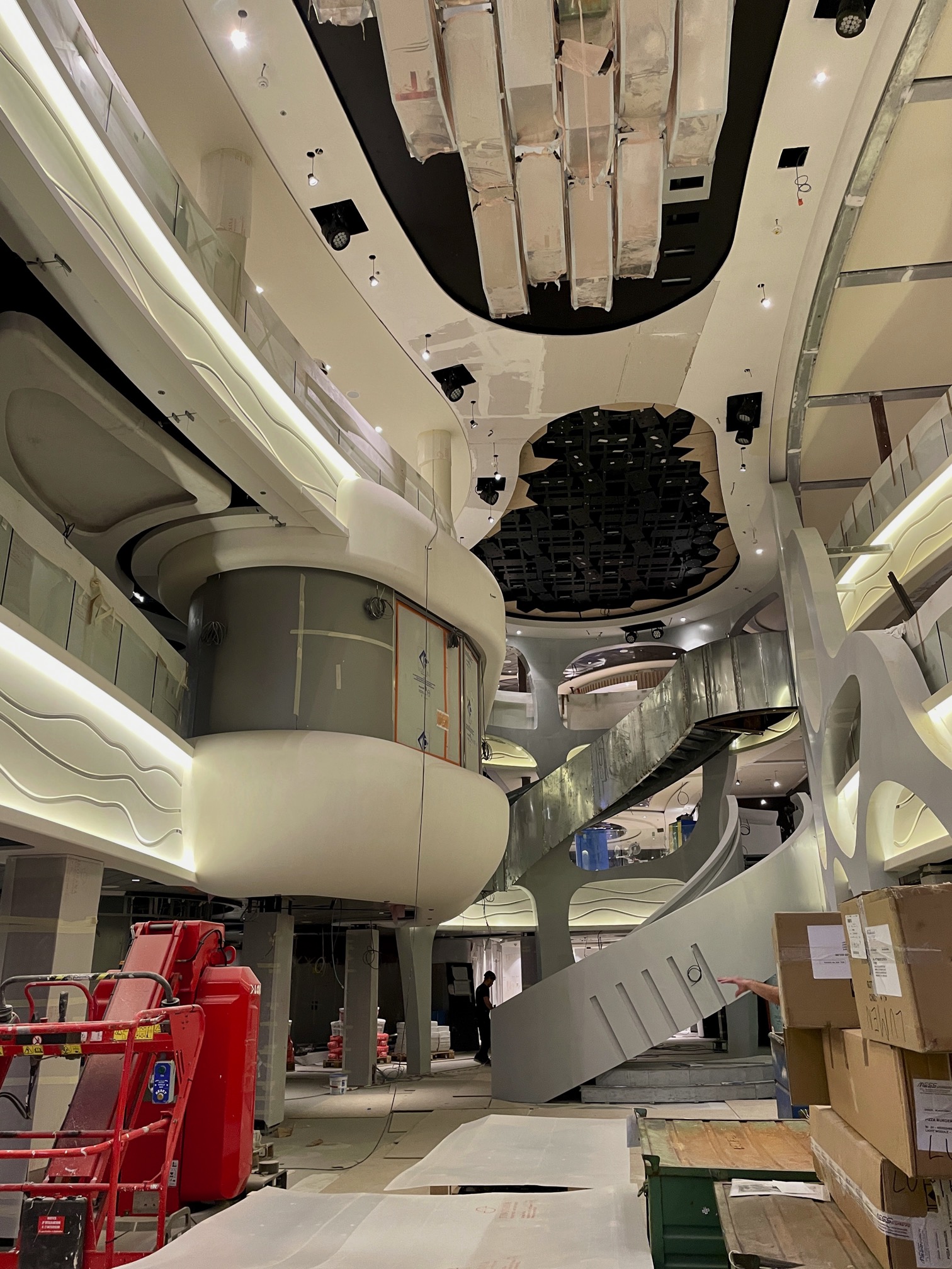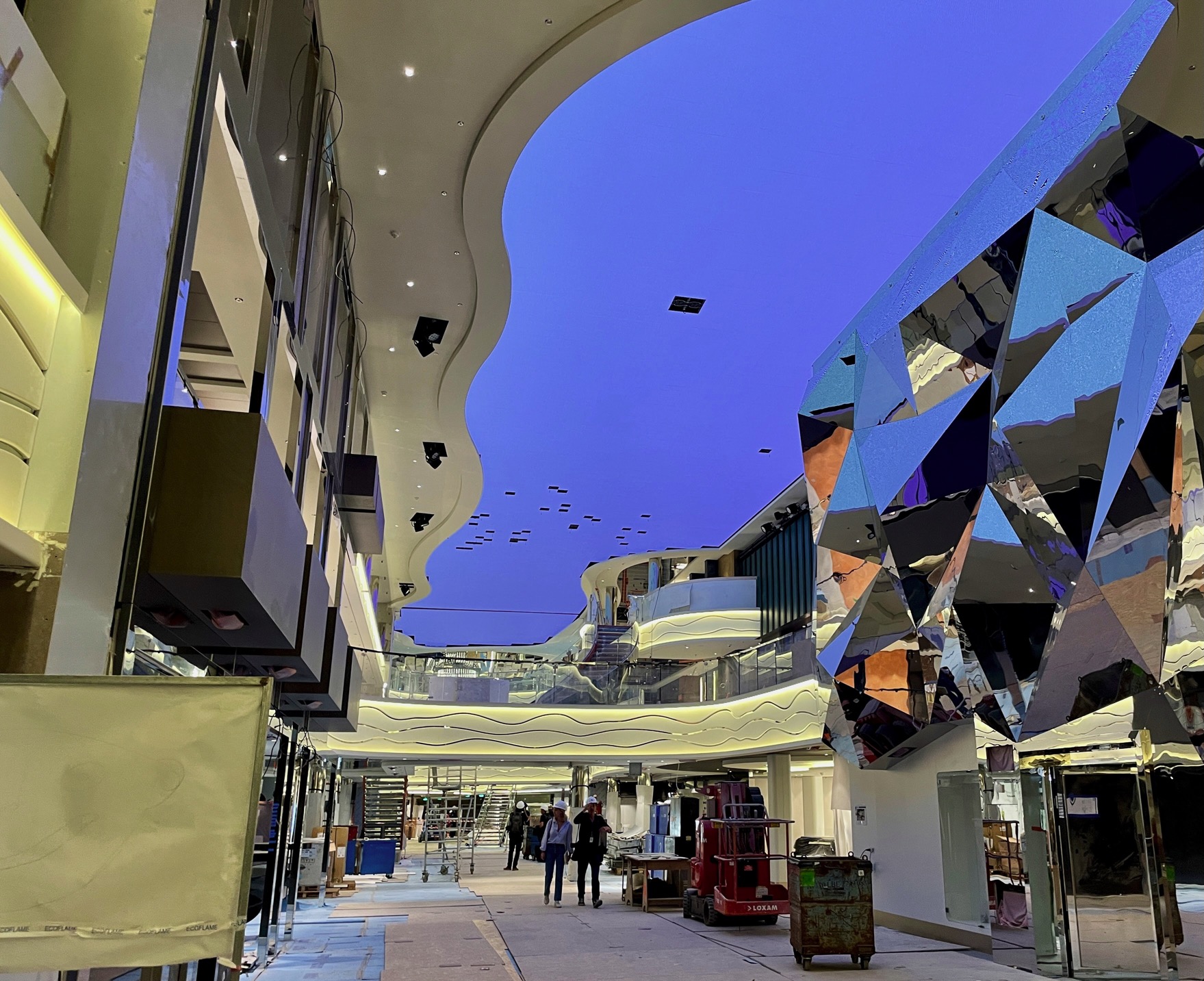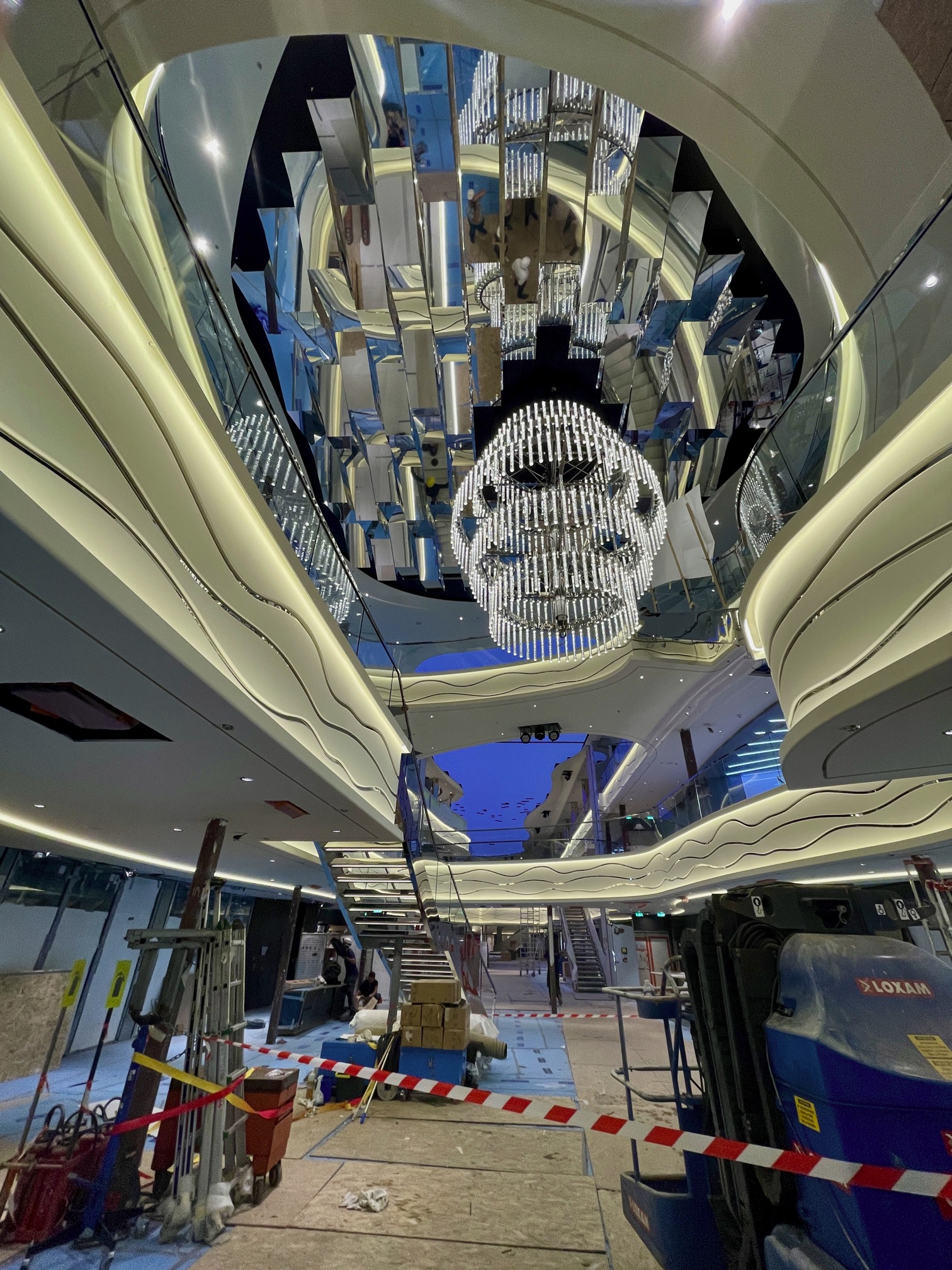 We startten de rondleiding met een bezoek aan de World Galleria: de binnenpromenade van drie dekken waar je bars, restaurants en winkels vindt. De binnenpromenade ken je ook van schepen zoals de MSC Virtuosa, MSC Grandiosa etc. Ook op de MSC World Europa zal het LED dak van de promenade weer de show gaan stelen met mooie bovenkanten. De kroonluchter was net opgehangen!