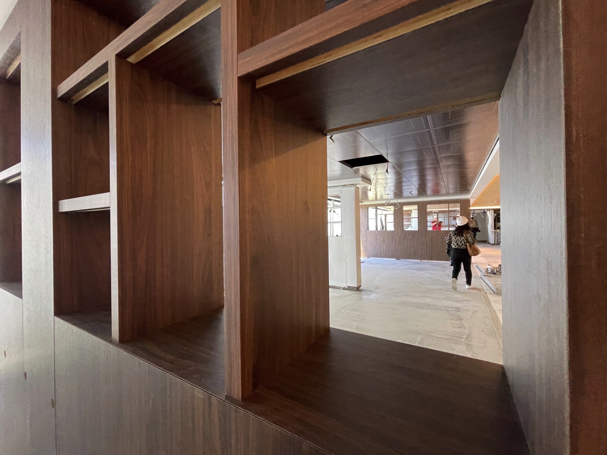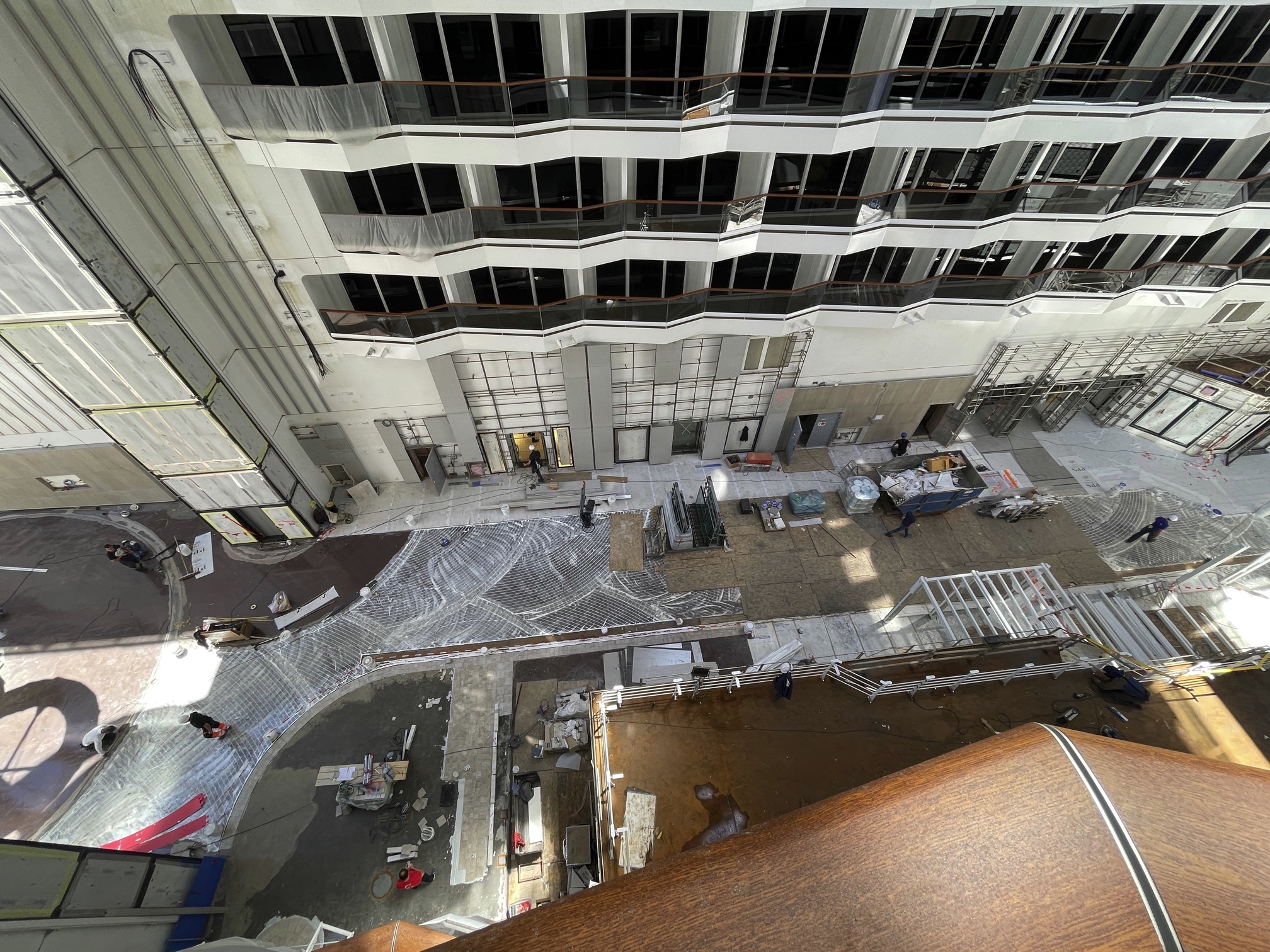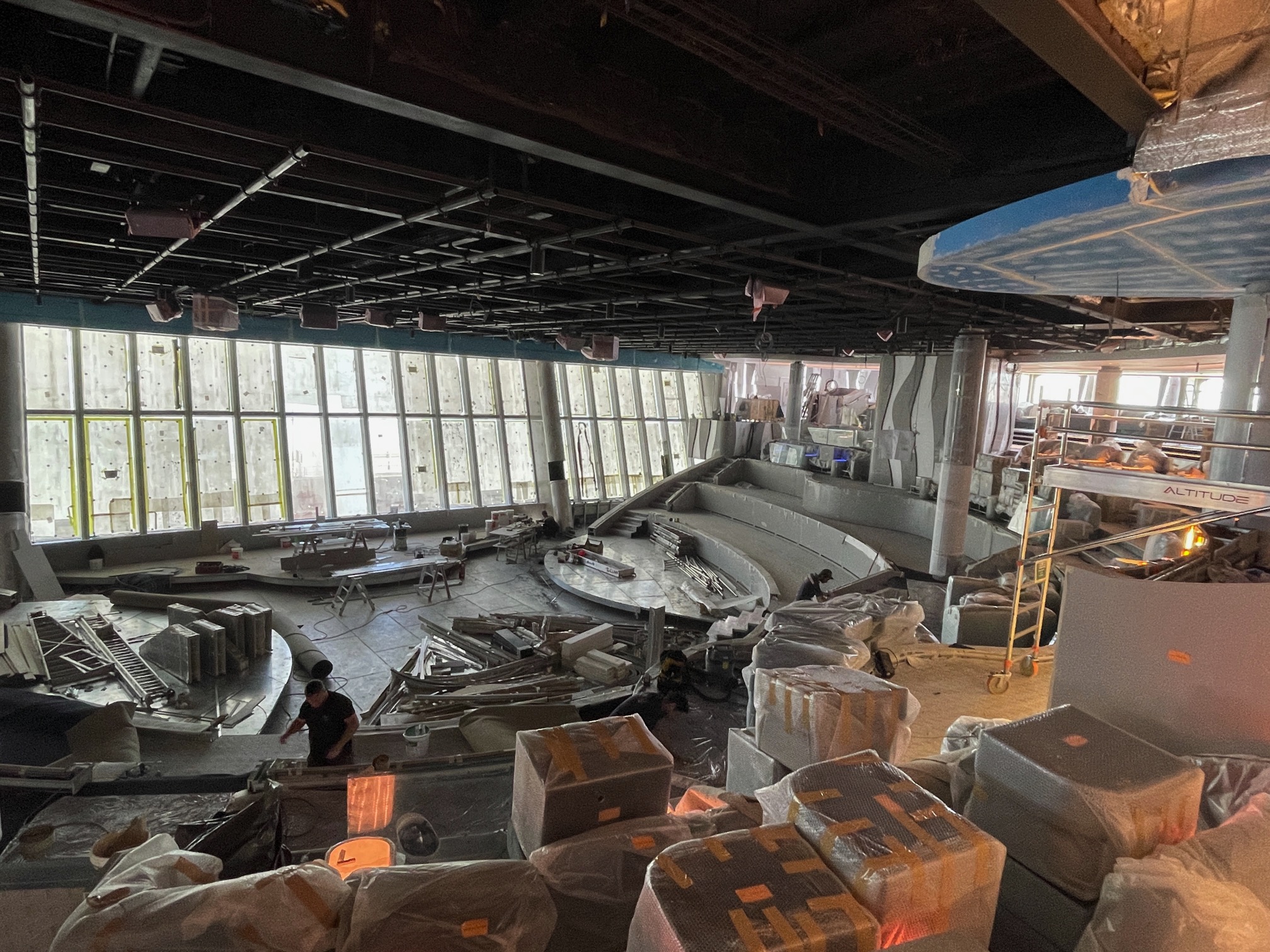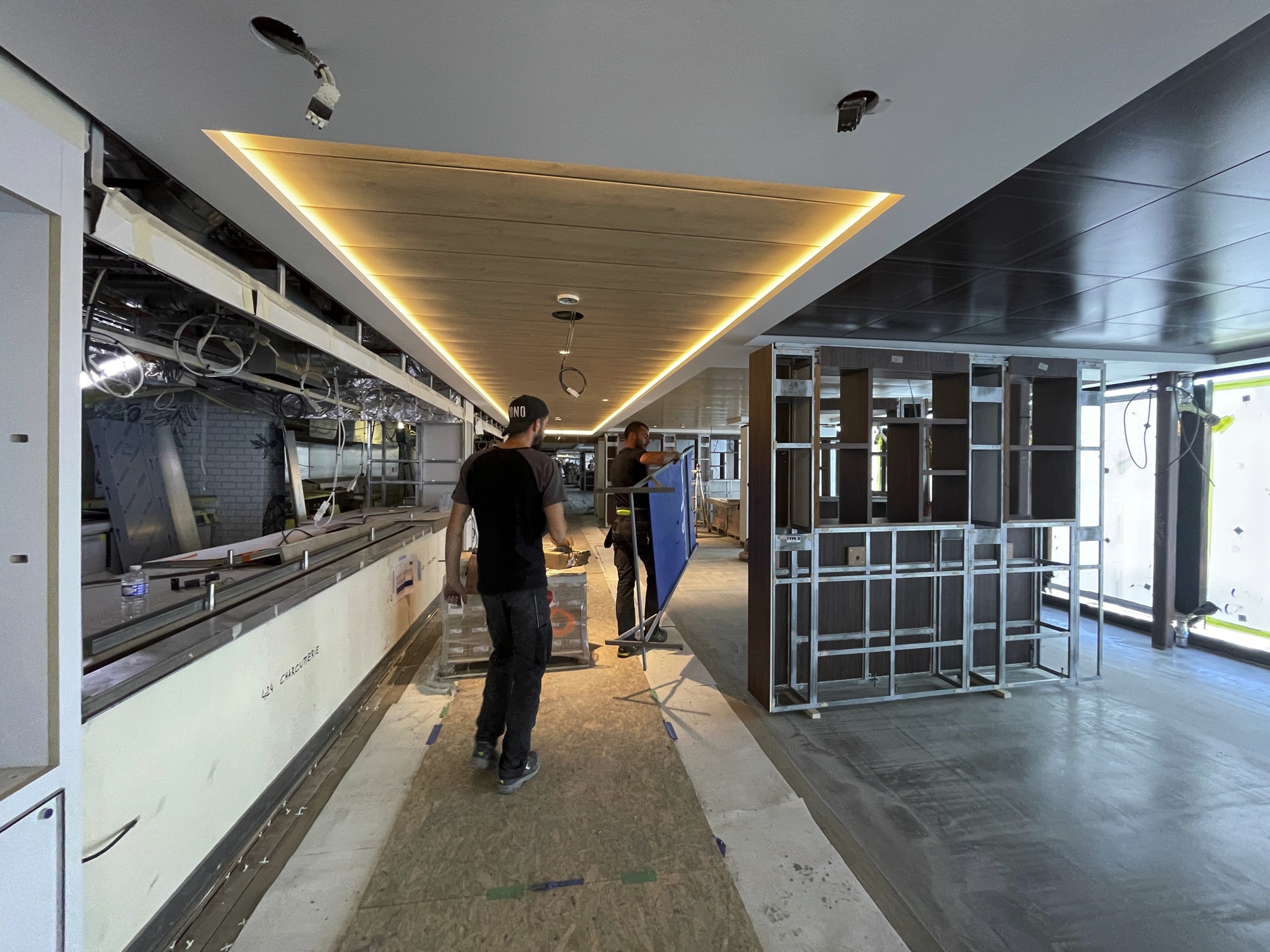We startten de rondleiding met een bezoek aan de World Galleria: de binnenpromenade van drie dekken waar je bars, restaurants en winkels vindt. De binnenpromenade ken je ook van schepen zoals de MSC Virtuosa, MSC Grandiosa etc. Ook op de MSC World Europa zal het LED dak van de promenade weer de show gaan stelen met mooie bovenkanten. De kroonluchter was net opgehangen!