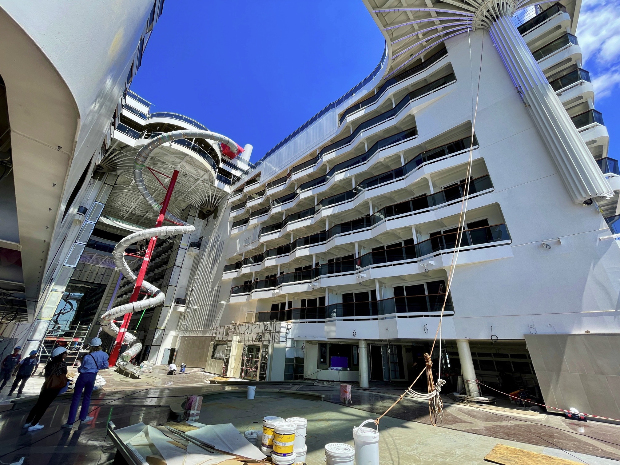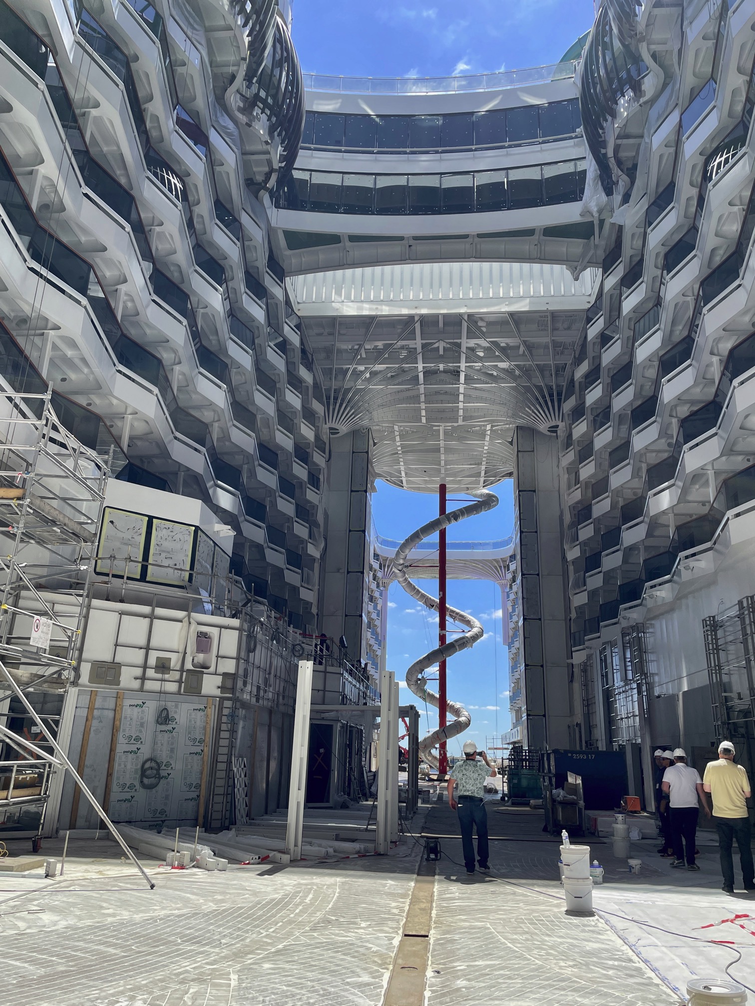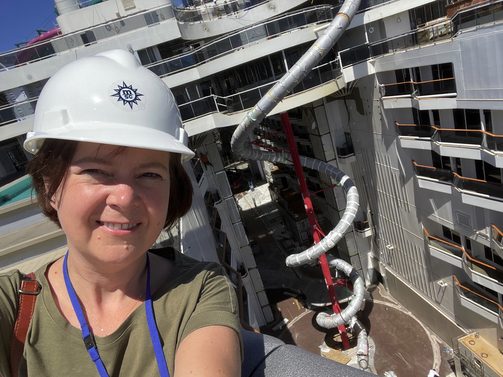 Miriam was op uitnodiging een aantal uur aan boord om te zien hoe ver de bouw en inrichting vordert. Een unieke ervaring! We lopen het schip door en pakken de ruimtes eruit die al zeer ver gevorderd waren. Interessant om te weten is dat de scheepsbouwer van achter naar voren werkt en van beneden naar boven. Zo was de MSC Yacht Club nog niet af, omdat deze op de hoogste dekken ligt én vooraan.