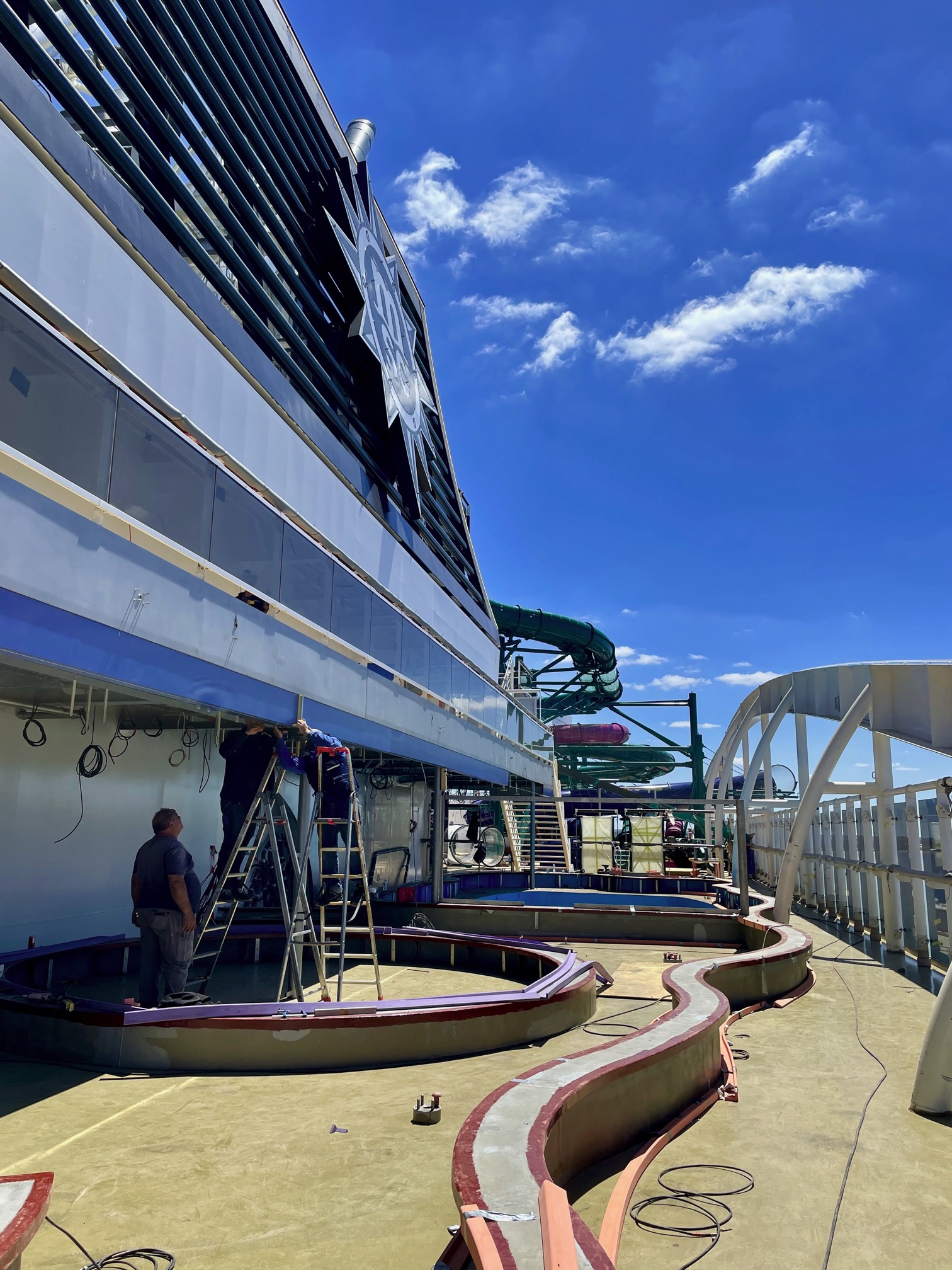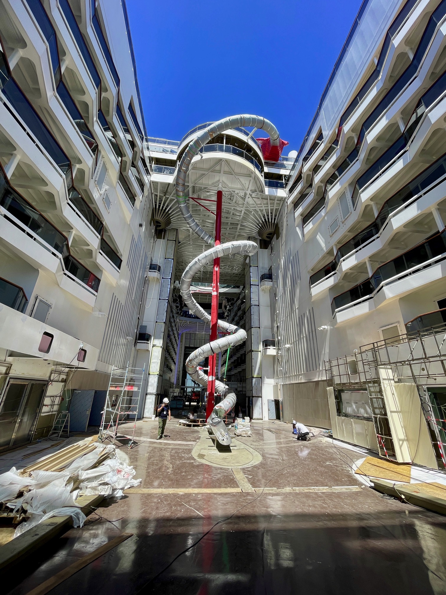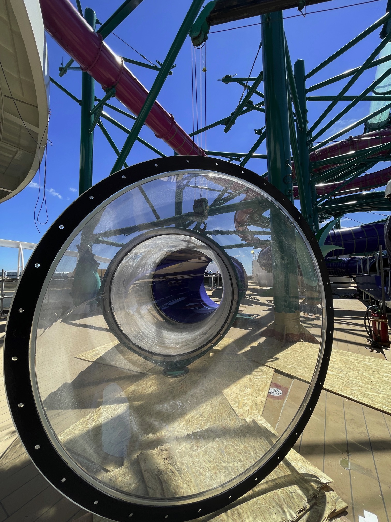 Met één van de liften die al geïnstalleerd was, werden we naar dek 20 gebracht. Daar bevindt zich het Aquapark met kinderzwembaden en diverse glijbanen, waaronder een glijbaan waar je met een VR bril doorheen gaat.