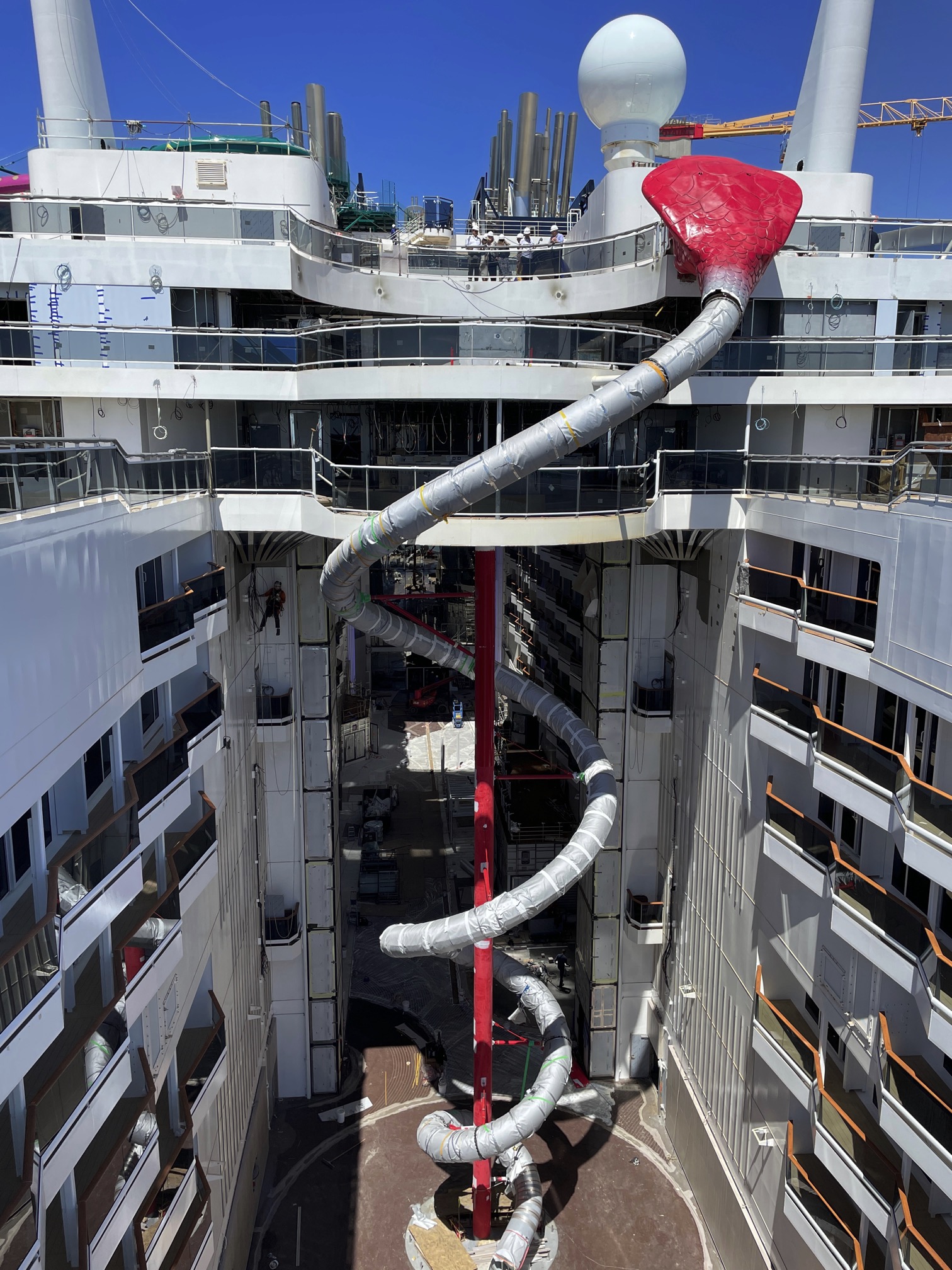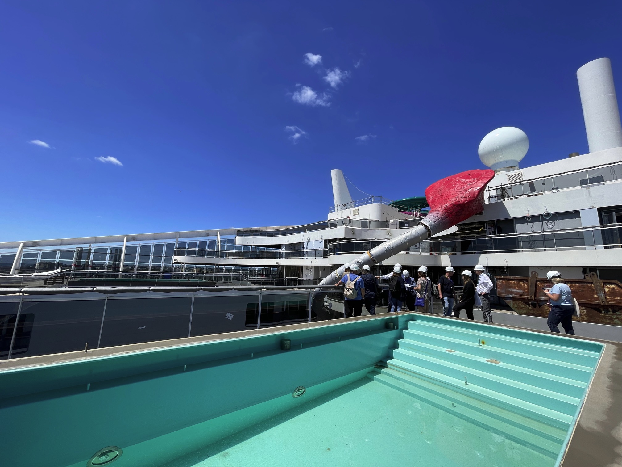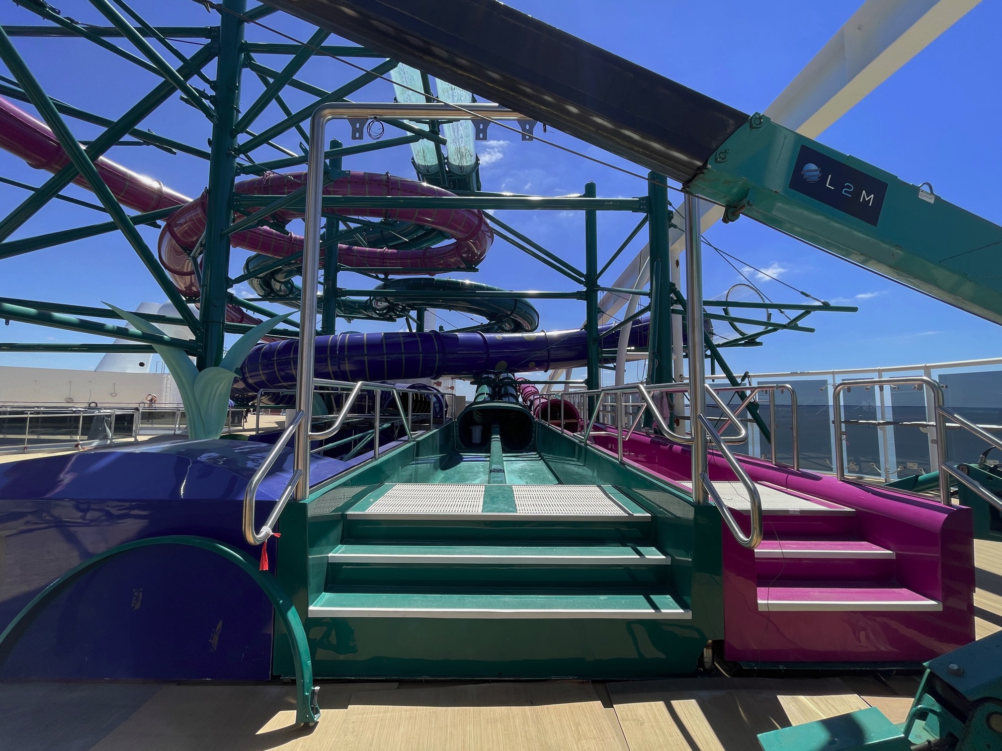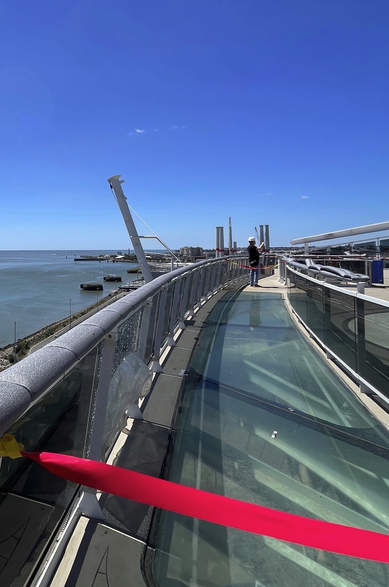 Met één van de liften die al geïnstalleerd was, werden we naar dek 20 gebracht. Daar bevindt zich het Aquapark met kinderzwembaden en diverse glijbanen, waaronder een glijbaan waar je met een VR bril doorheen gaat.