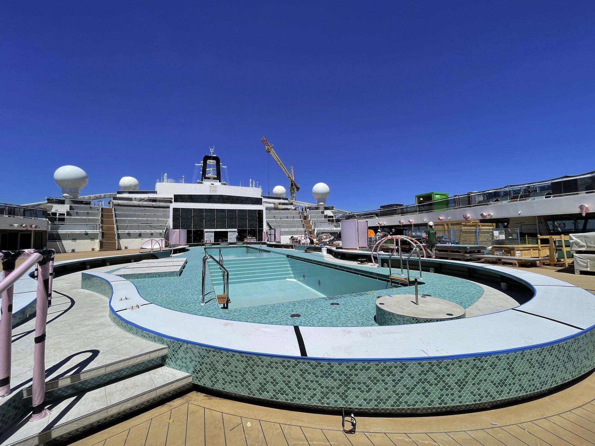 Het schip biedt nog meer zwembaden: bij de MSC Yacht Club, een binnenzwembad met schuifdak ‘Botanic Garden Pool’ en La Plage, het grote centrale zwembad. Hieronder zie je de eerste indrukken van La Plage: