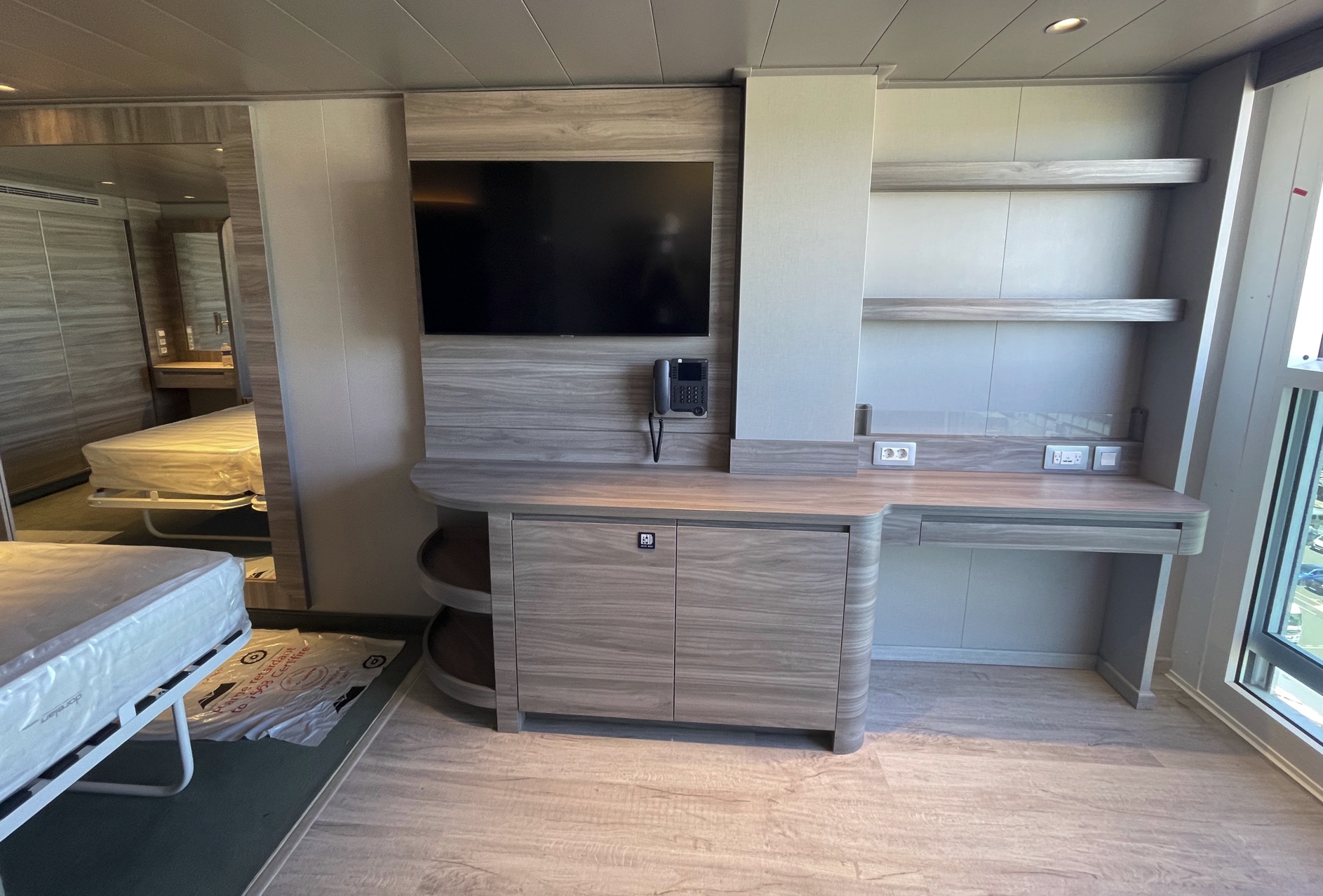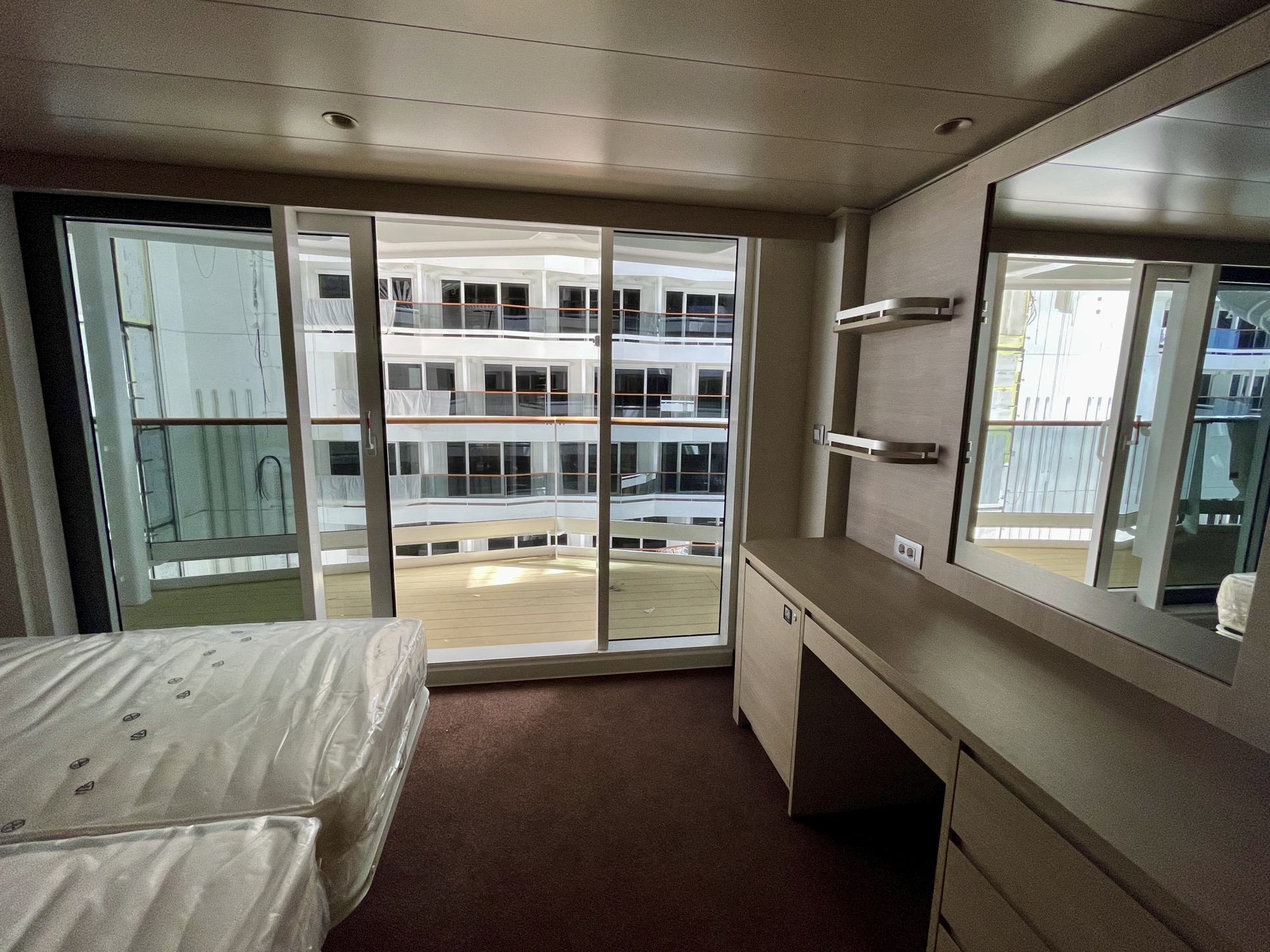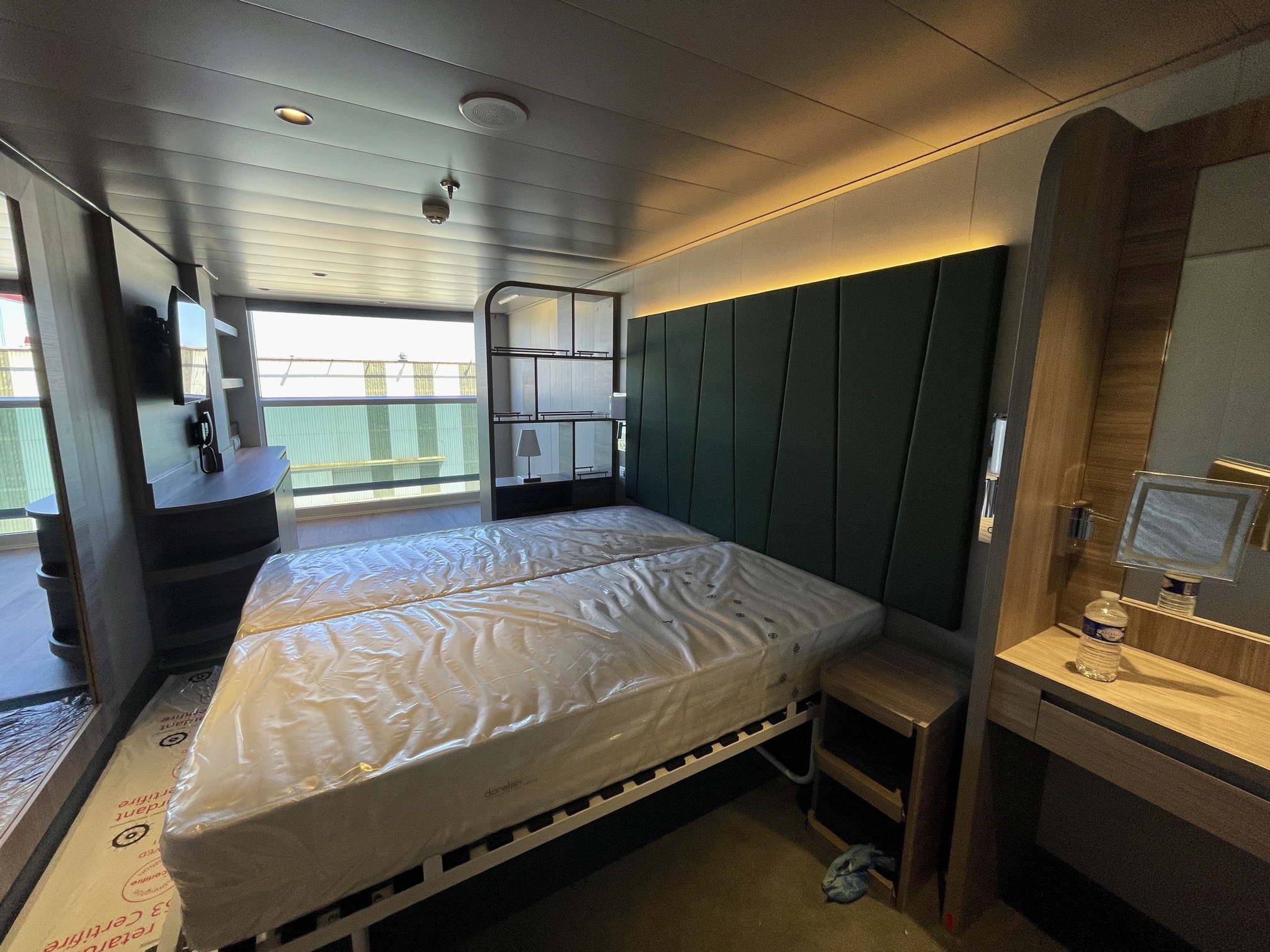 Scheepsbouwer Chantiers heeft volop ervaring met de bouw van de nieuwe generatie hutten: de infinity hutten. Het bovenste gedeelte van het raam kan open. MSC kiest ervoor om geen separate balkonstoelen te plaatsen, dus alleen het bankje. Deze ‘Infinity Ocean View’ hutten liggen overigens voornamelijk richting de voorkant van het schip over vier dekken. Leuk om te weten is dat de scheepsbouwer alle hutten zelf op een andere locatie samenstelt. Zijn ze klaar, dan worden ze als één geheel naar binnen gehesen. Alleen de leidingen moeten dan nog geïnstalleerd worden. Als laatste wordt het beddengoed en losse inrichtings voorwerpen binnengebracht.