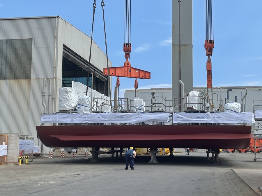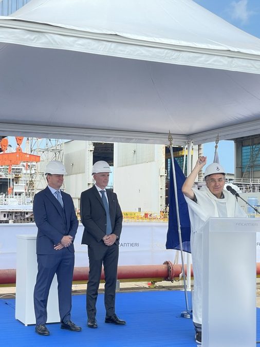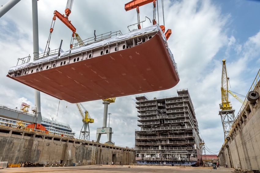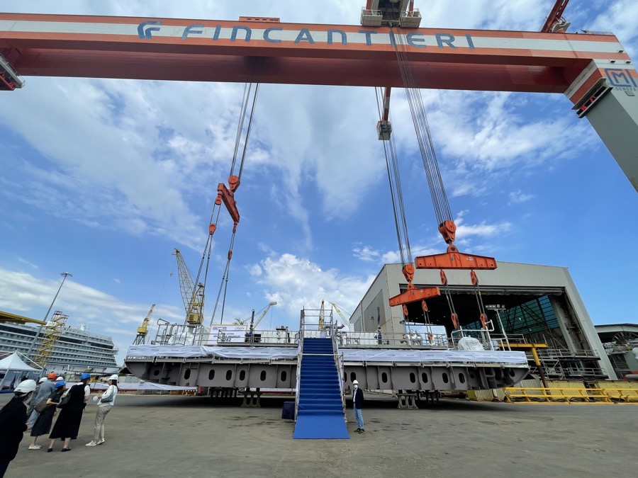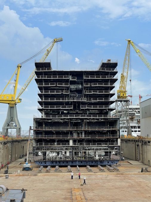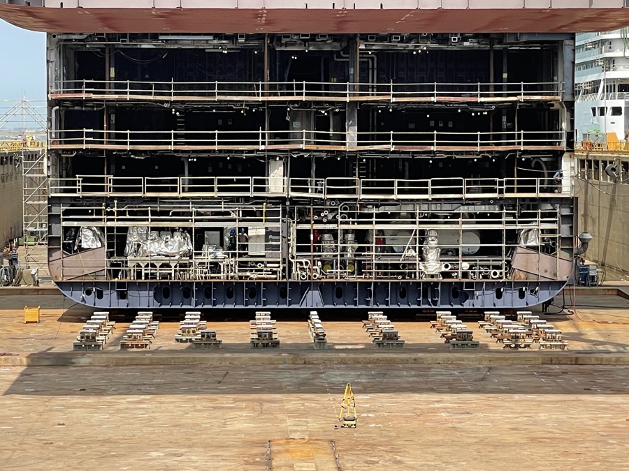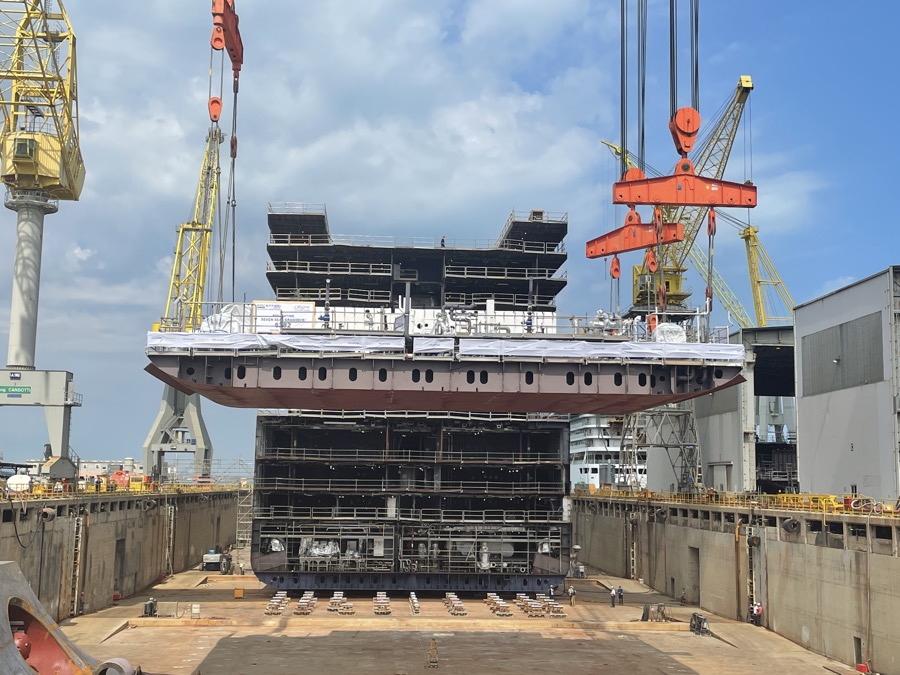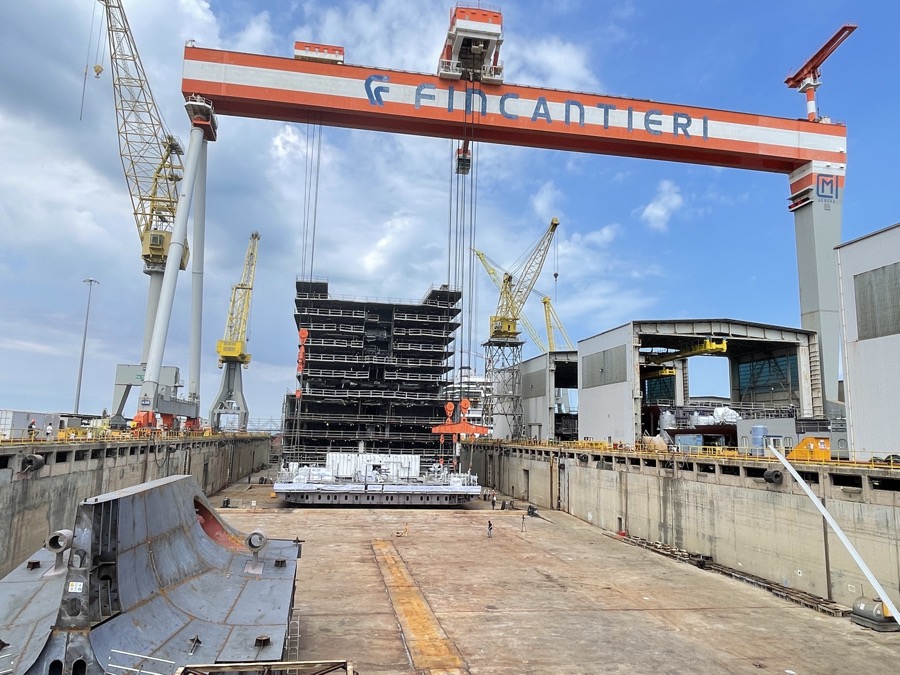 De scheepsbouwers van Fincantieri hebben overigens na het snijden van het eerste stuk staal in november 2021 niet stilgezeten: momenteel staat er al een groot geraamte in het dok, zo ongeveer een derde schip – van midscheeps naar de voorkant van het schip. De steunblokken voor het stuk staal dat er zo ingehesen gaat worden, liggen al klaar.