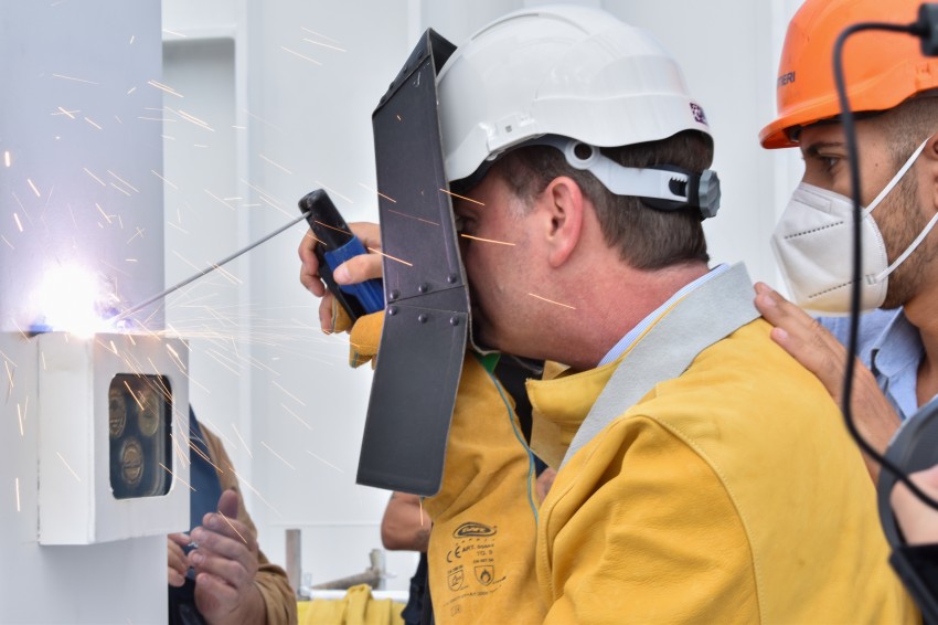 President van de rederij, Jason Montague en scheepswerfmanager Gilberto Tobaldi, hebben de eer om de munten op het blok neer te leggen waarna Montague met een medewerker van Fincantieri ze vastlassen. Het grote blok staal is een gedeelte van de onderkant van het schip. Ik zie op dit stuk staal al tal van buizen, isolatiemateriaal en meer, dat allemaal onderdeel van de machinerie gaat zijn.
