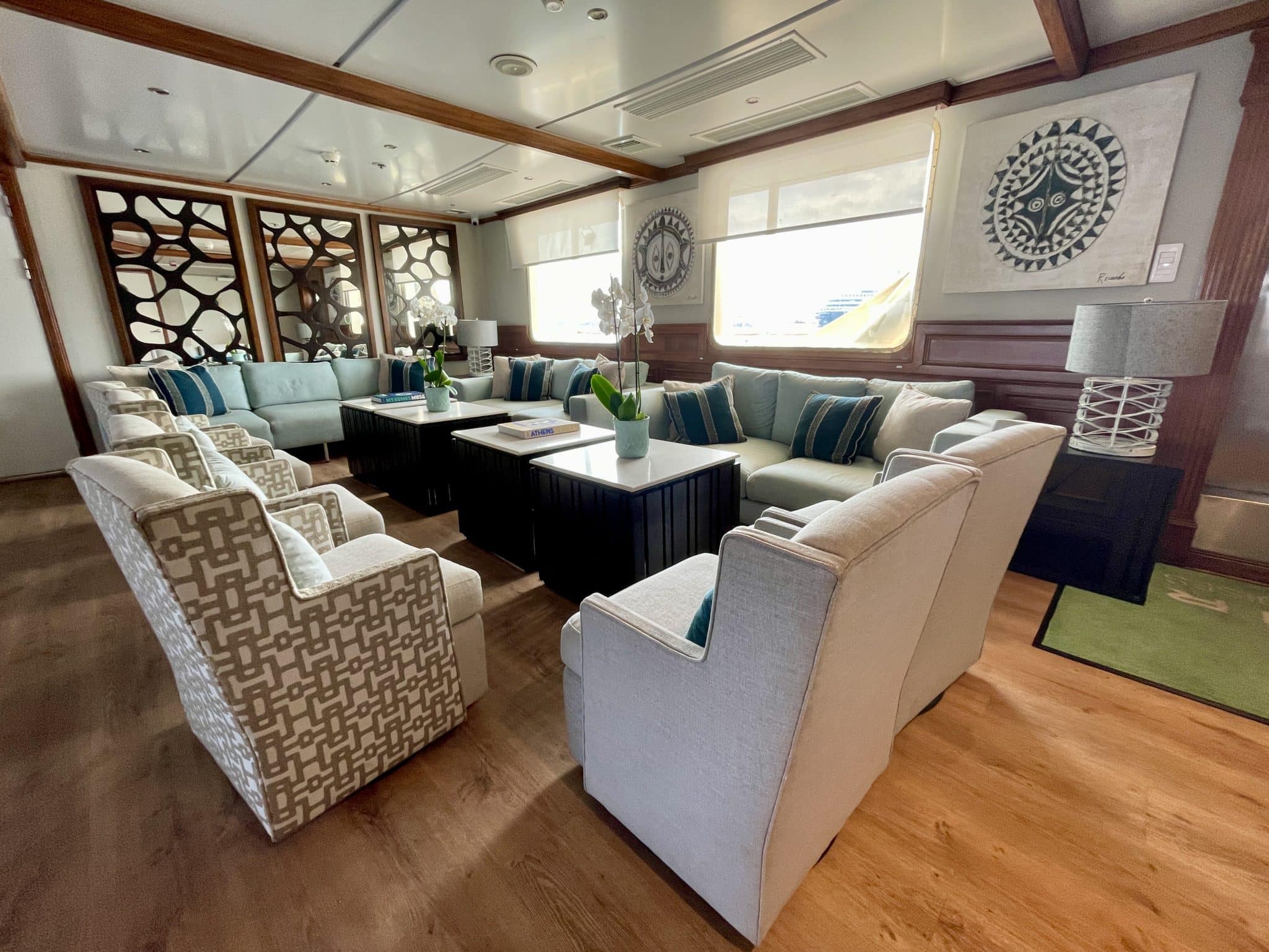 In de lounge wordt de veiligheidsinstructie gegeven en gedurende de week zie je dat gasten die even hun laptop willen gebruiken, daar gaan zitten. Wifi is overal op het schip gratis en de snelheid is uiteraard wel afhankelijk van de locatie van het schip, bij een eiland is de ontvangst vaak veel beter. In de avonden is het buiten zwoel en zijn de overige passagiers vooral buiten te vinden.