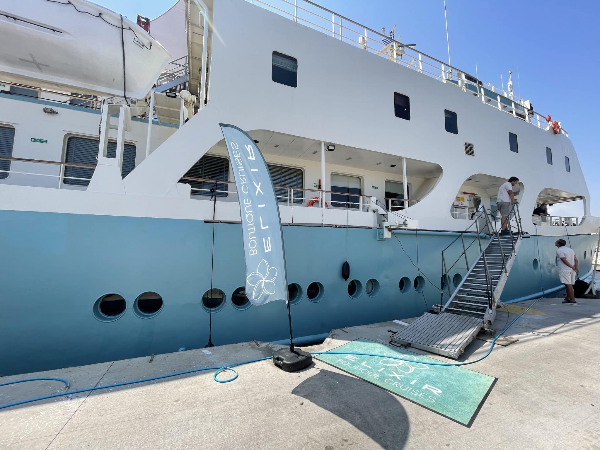 In de verte valt het kleine schip bijna niet op tussen de grote ferry schepen in de haven van Lavrio, ten zuidoosten van Athene. De Elysium is een schip van maar 64 meter lang en biedt plek voor maximaal 48 passagiers. Wellicht kennen sommigen het schip nog van een cruise door de Galapagos Eilanden, want de Elysium voer vanaf haar bouw in 1982 tot 2019 voor diverse rederijen als expeditieschip rond in dat gebied. Daarna kwam ze naar Europa om voor Elixir Cruises te gaan varen, maar wel met een flinke smaakvolle geslaagde renovatie.