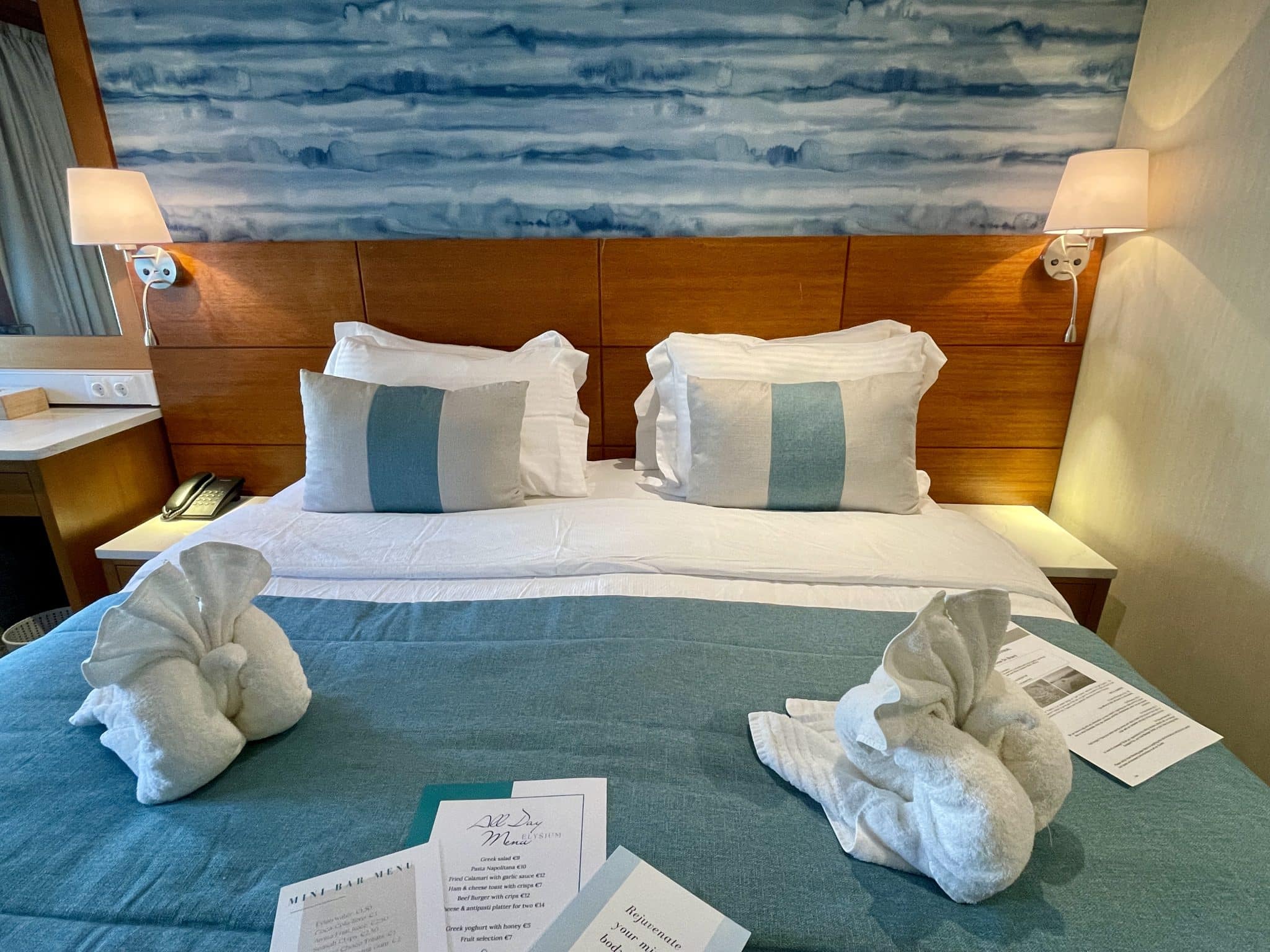 Mijn hut bereikte ik via de trap vanaf de receptie naar beneden, en vervolgens langs een watertappunt in de gang. Deze hut ligt midscheeps met aan beide kanten andere hutten. Bij binnenkomst ben ik blij verrast door de grootte van de hut. De indeling van deze hut is vrijwel hetzelfde als reguliere hutten op grotere cruiseschepen: bij binnenkomst zijn rechts de kledingkasten met een kluisje, badjassen en badslippers. Vervolgens ligt links de badkamer en verder doorlopend het heerlijke bed, bureau en minibar (toeslag, zeer schappelijk geprijsd). Opvallend fijn is dat bij het bureau er maar liefst 4 stopcontacten zijn (geen reisstekker nodig!) en bij elk nachtlampje aan weerszijden van het bed ook usb oplaadpunten. De kamer is sfeervol gedecoreerd met zee-kleuren. Een tv is in te stellen op bijvoorbeeld je persoonlijke Netflix account, maar biedt verder geen reguliere tv kanalen.