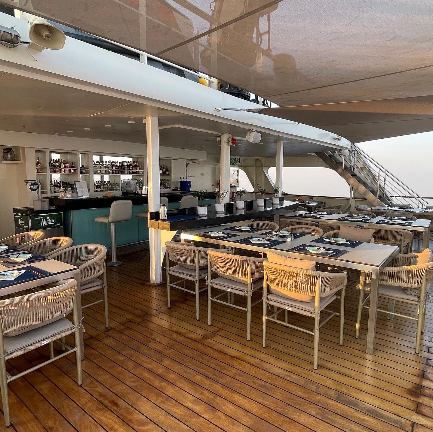 Naast de receptieruimte bereik je via een deur de eetruimte. Het buffet staat hier in de ochtend, middag of avond klaar voor je. In een volgend artikel zal ik daar dieper op in gaan. Afhankelijk van het weer, zullen de tafels buiten vaak gedekt zijn. Tijdens mijn cruise hebben we overigens altijd buiten gegeten, wat echt heerlijk is om te kunnen doen. Grote doeken en parasols gaven schaduw op dit dek.