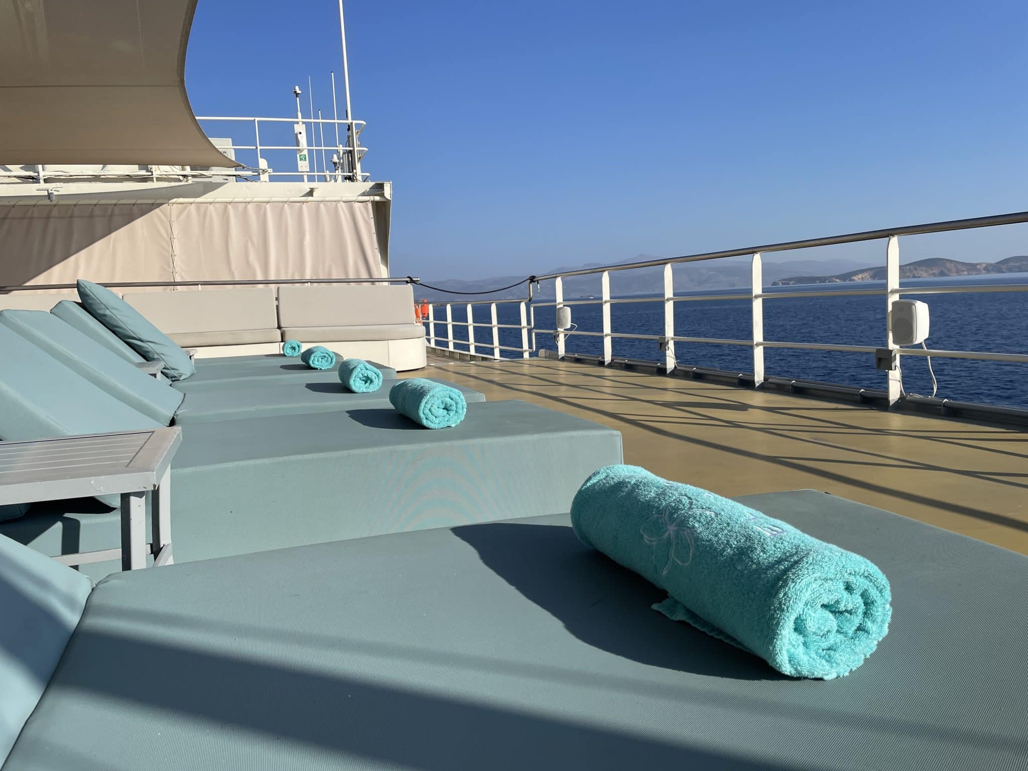 Wil je zonnebaden, dan ga je twee dekken hoger. Deze is via de trappen makkelijk te bereiken. Tien ligbedden en een lange lounge bank bieden plek in de schaduw of zon. Grote schaduwdoeken hangen boven je. Afkoelen kan je in de whirlpool, maar deze is ivm de huidige COVID periode niet altijd beschikbaar. Overigens, de (gratis) yoga en pilates lessen vinden op dit dek plaats. De spa aan boord omvat een menu met diverse soorten massages en schoonheidsbehandelingen (toeslag).