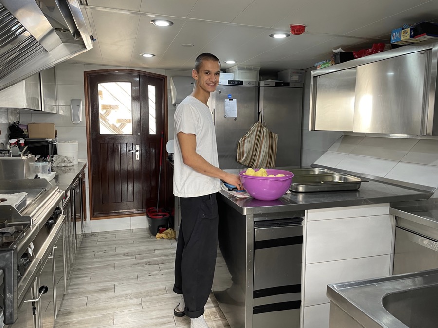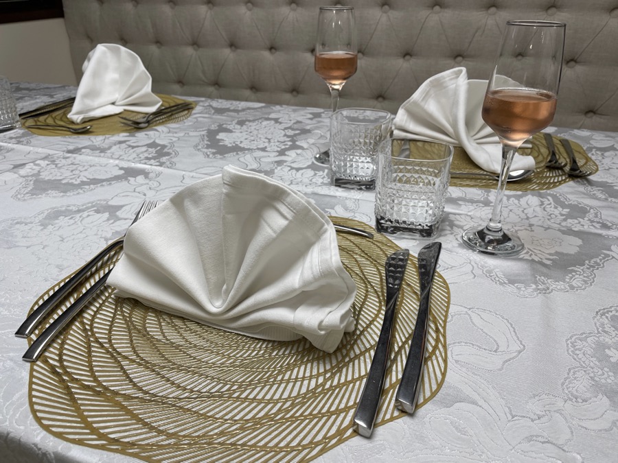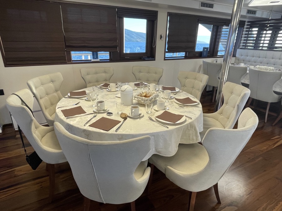 Bij de lunch en avondeten krijg je vaste plaatsen toegewezen. Er zijn 3 grote ronde tafels voor 8 personen en 2 langwerpige tafels voor 8. De gerechten worden vrijwel allemaal uitgeserveerd, behalve de salade.