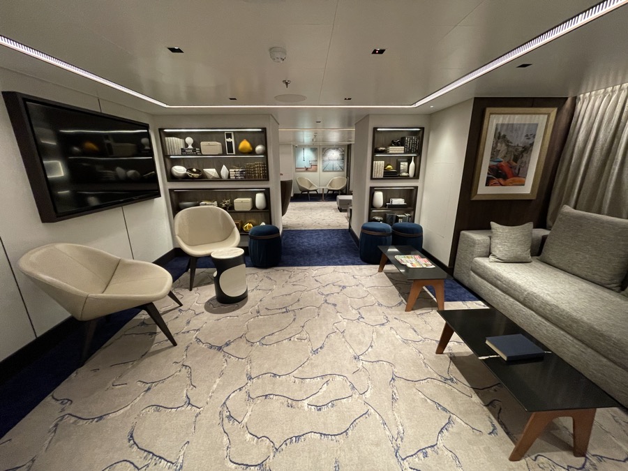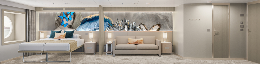 De 4 luxe Aft Facing Owner’s Suites (90-92 m2) hebben plek voor 4 personen. Ze omvatten een slaapkamer met queensize bed en een badkamer. De andere 2 personen slapen in de woonkamer. Op het grote balkon (49-50 m2) aan de achterzijde van het schip heb je een geweldig uitzicht. Bij de meeste suites vind je er wederom een whirlpool.