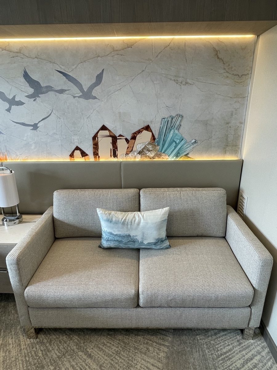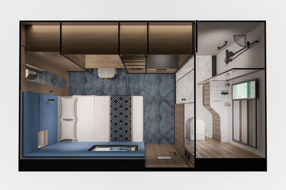 De binnenhutten zijn zeer licht van kleur, in tegenstelling tot de donkerblauwe studio’s. Het kleurrijke kunstwerk aan de hoofdzijde van het bed trekt gelijk de aandacht. Een ander opvallend detail is de ruimte onder het bed. Het zorgt voor een meer ruimtelijk gevoel, maar heeft ook een keerzijde. Veel cruisereizigers zijn gewend om hun koffer onder het bed te plaatsen. Deze is nu dus altijd zichtbaar, wat wellicht niet iedereen als prettig zal ervaren. De hut beschikt verder ook 2 losse bedden die kunnen worden samengevoegd tot queen-size bed, een USB-aansluiting bij het bedlampje (!), een bureautje met poef en verder de standaardfaciliteiten zoals een flatscreen-televisie, een koelkastje, een kluisje en een haardroger.