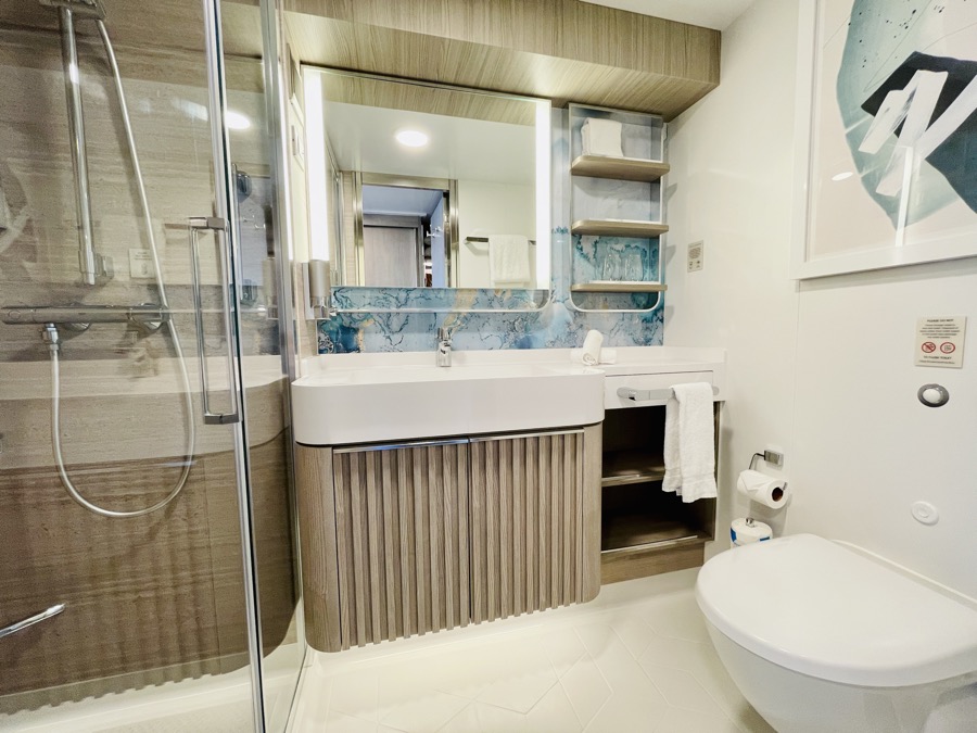De 13 Owner’s Suites met groot balkon zijn wat kleiner dan de vorige genoemde suites met 50-57 m2. Je kunt met 4 personen in deze suite verblijven. Er is 1 slaapkamer met queensize bed en een badkamer. Het balkon is zo’n 10-12 m2.