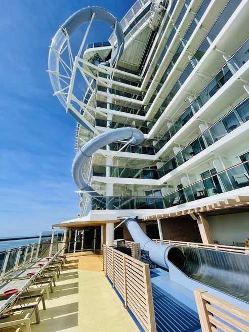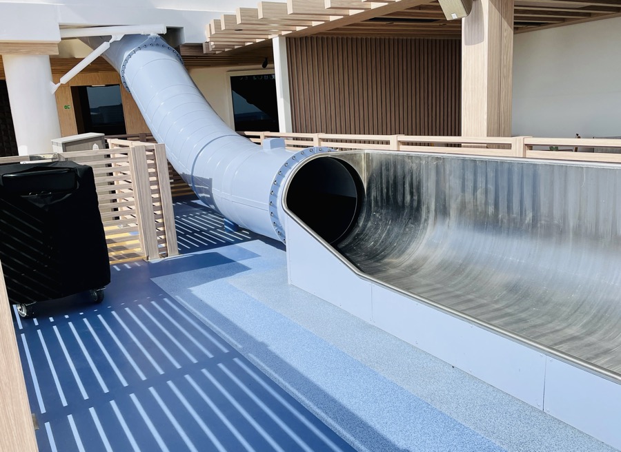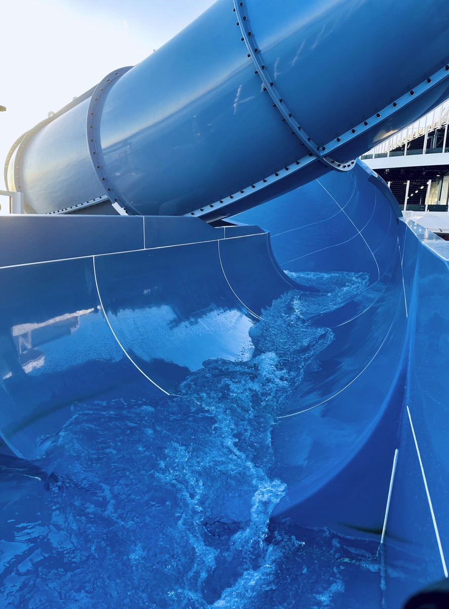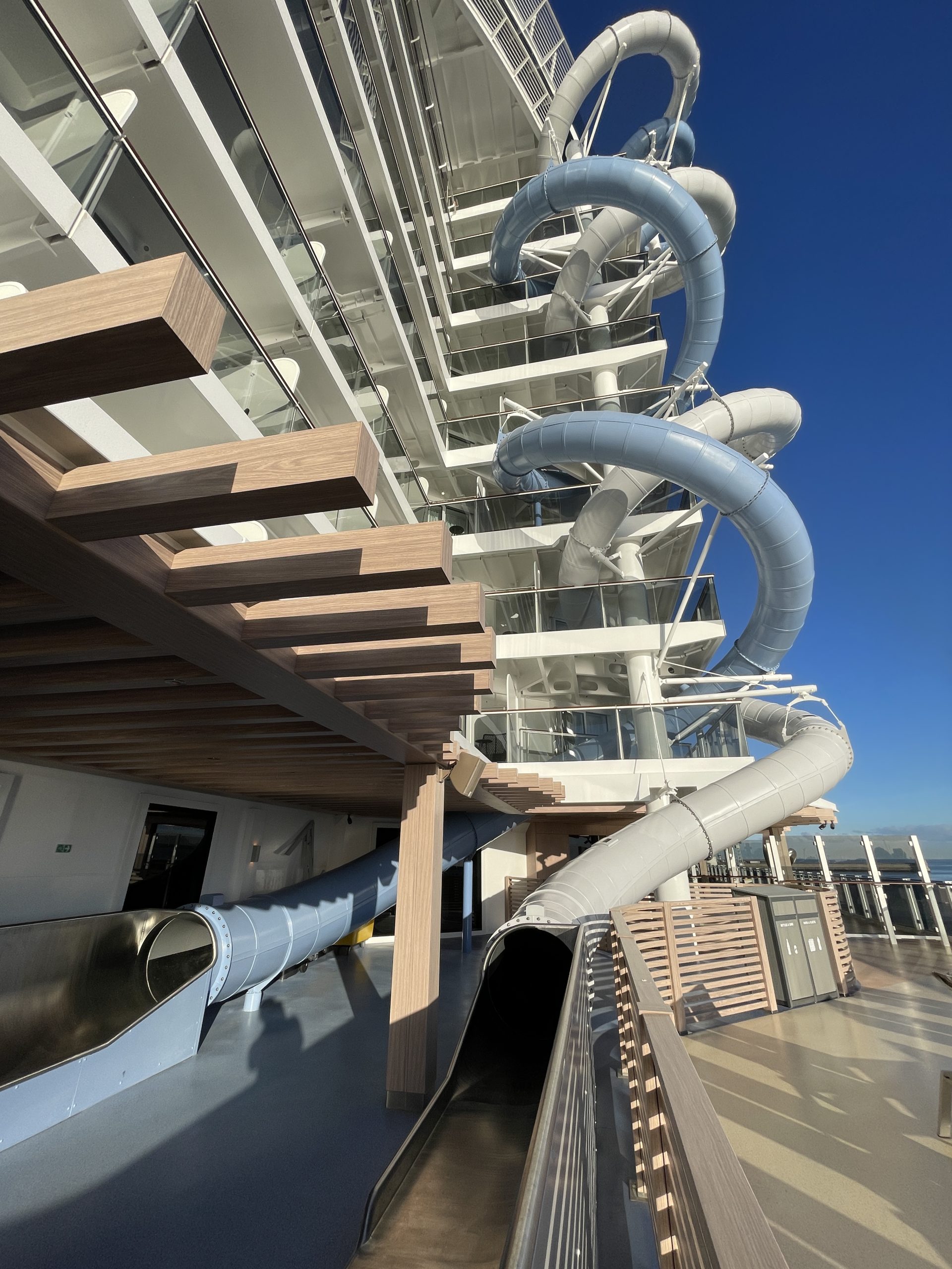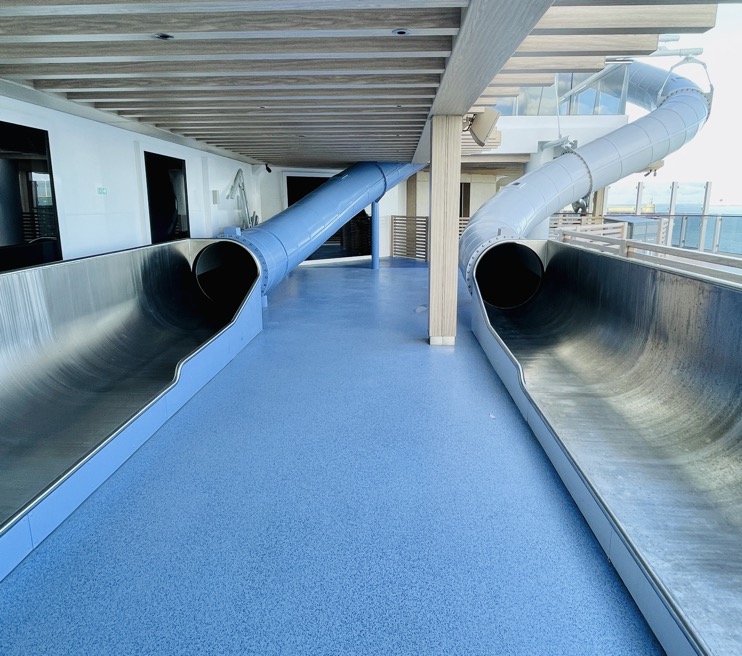 The Drop en The Rush zijn de (droge) glijbanen die je van dek 18 naar dek 8 brengen. Deze zie je vanaf de buitenkant goed lopen langs en zelfs door balkons heen. De balkons waar deze doorheen gaan, zijn afgescheiden gedeelten en dus geen echte balkons die bij hutten horen. The Drop is ‘s werelds eerste droge glijbaan met vrije val en bij The Rush kan je tegen andere passagiers racen naar beneden. Uit eigen ervaring kan ik je zeggen dat het een echte adrenaline rush is.
