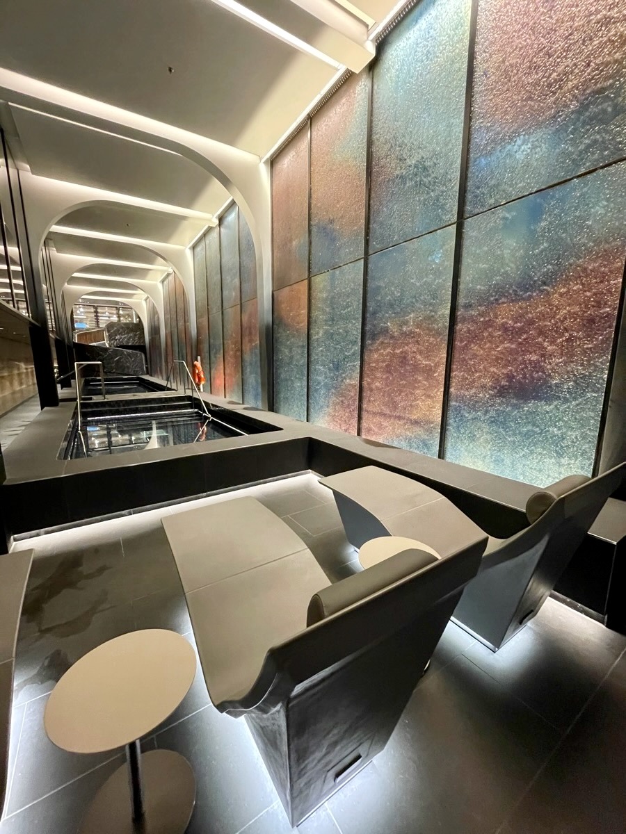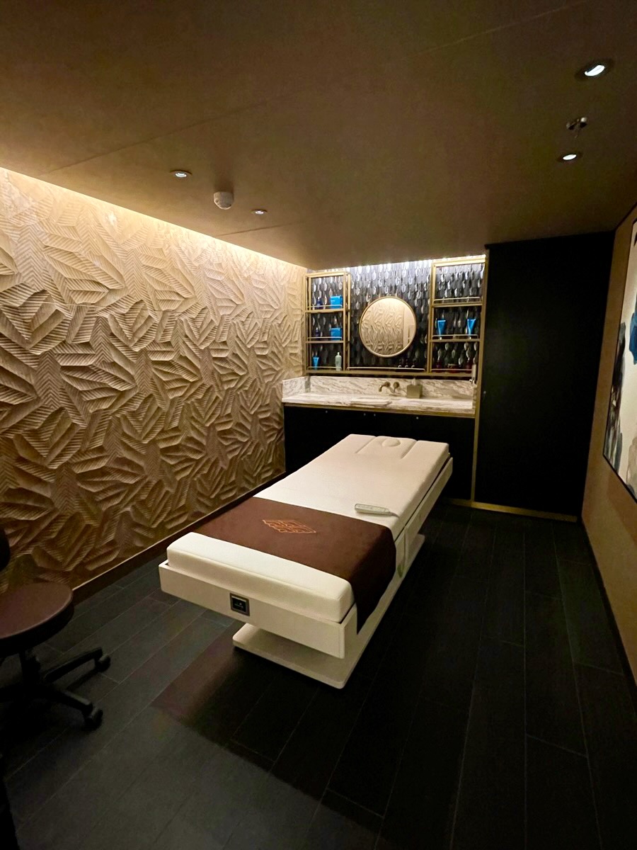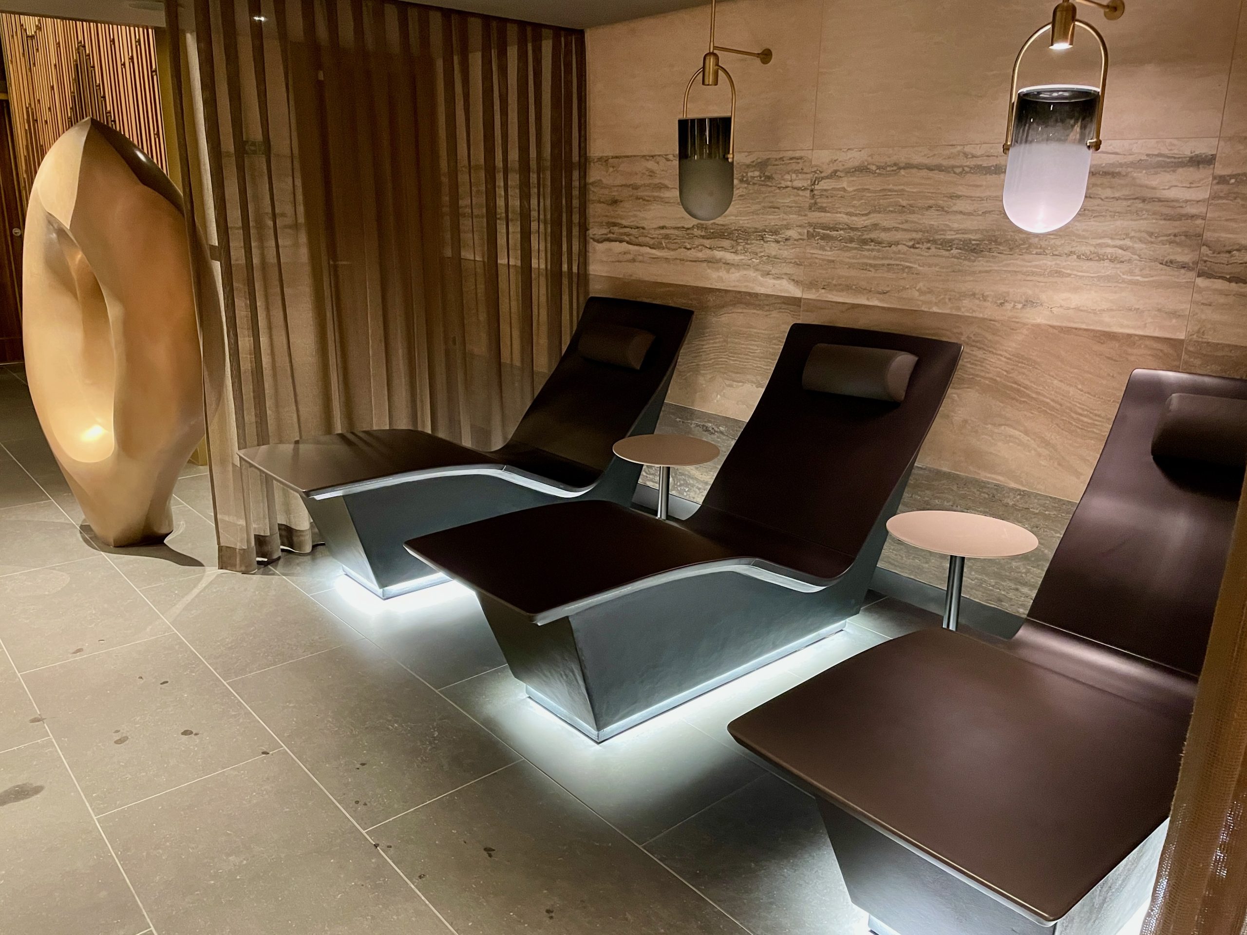 De Spa Thermal Suite is de mooiste plek om te vertoeven als je wilt ontspannen. Je kan hier tegen een vergoeding een dagdeel verblijven inclusief gebruik van de sauna’s, hydropools en de ligbedden. Je kunt vrij gebruik maken van de aromatische stoomruimte, de houtskool sauna met aan de wand houtskool, de Finse sauna, de zoutkamer met zouttegels aan de muur, de infrarood sauna en tot slot de ijskamer. Mooi detail is dat je daar ijs mag pakken en dat over je lichaam kunt wrijven ter afkoeling. De 2 hydropools, eentje met onderwaterstralen en een plonsbadje, worden geflankeerd door een waterval.