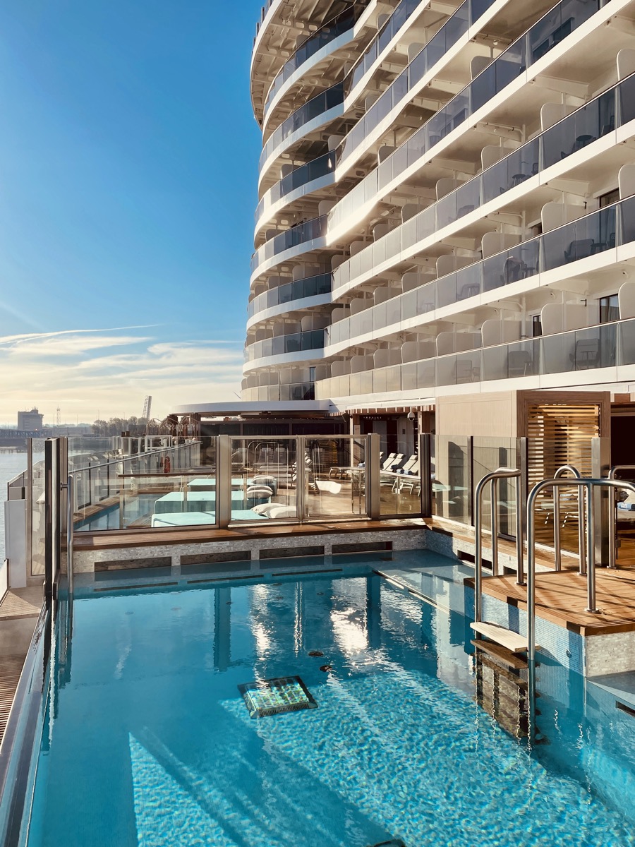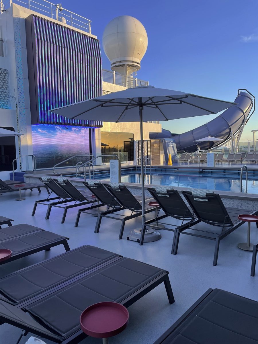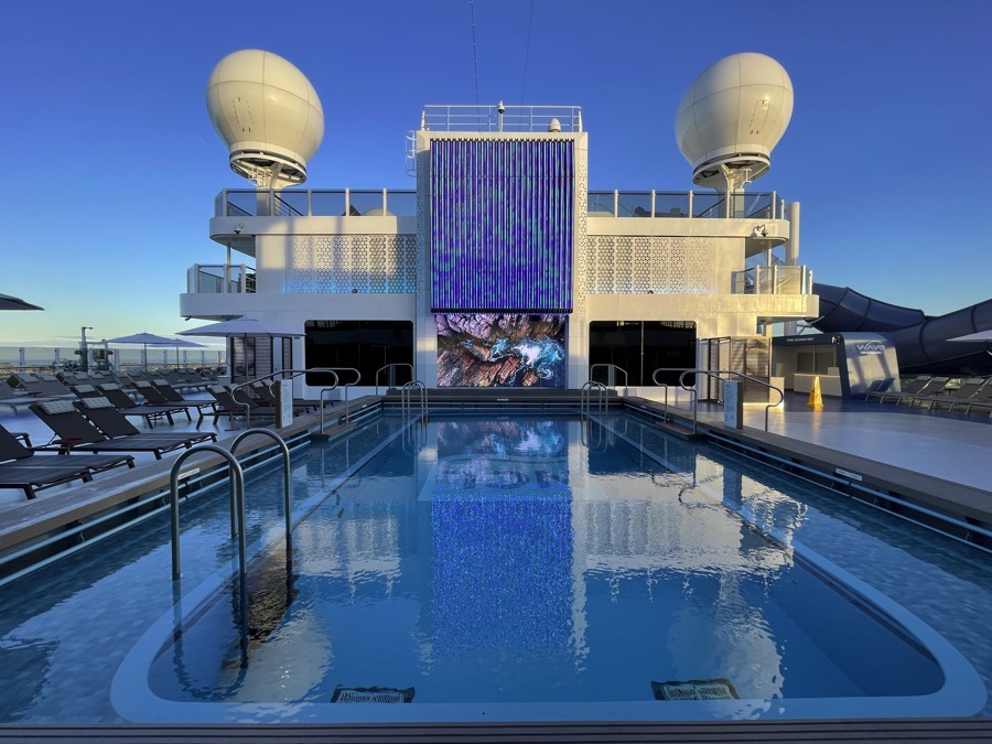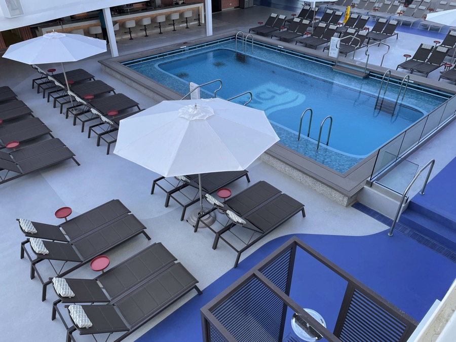Ontspanning vind je uiteraard ook in de mooie zwembaden, die stijlvoller dan ooit zijn. Op dek 17 ligt het pool dek met het enige echte zwembad. Deze doet overigens wat minder ruim aan, tussen de kartbaan en andere zonnedekken in. Aan beide zijden van het zwembadgebied vind je twee hottubs. De ligbedden, met handige tafeltjes, zijn erg comfortabel maar het zijn er hier niet veel. De rederij probeert op dit schip de gebieden wat kleiner te houden, en de overige ligbedden liggen dan ook verspreid over het hele dek. Ga dus zeker op zoek naar waar je het liefste wilt zitten.