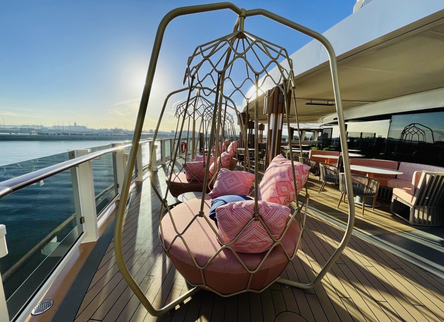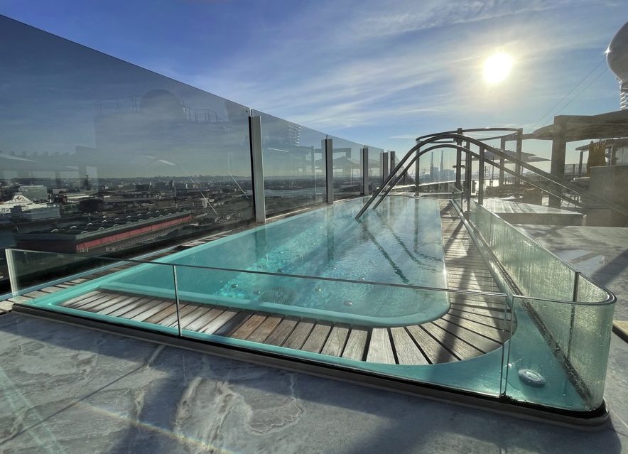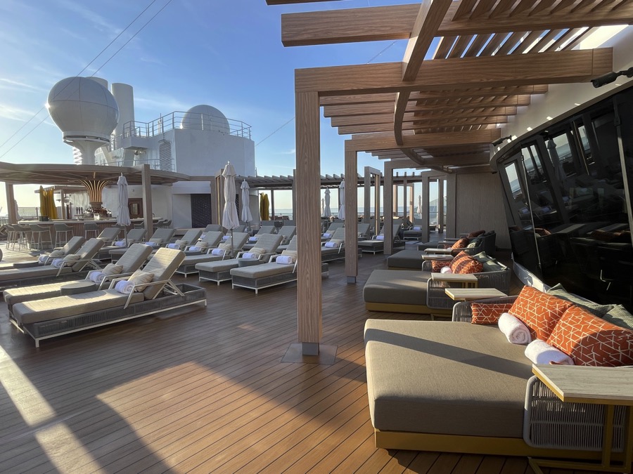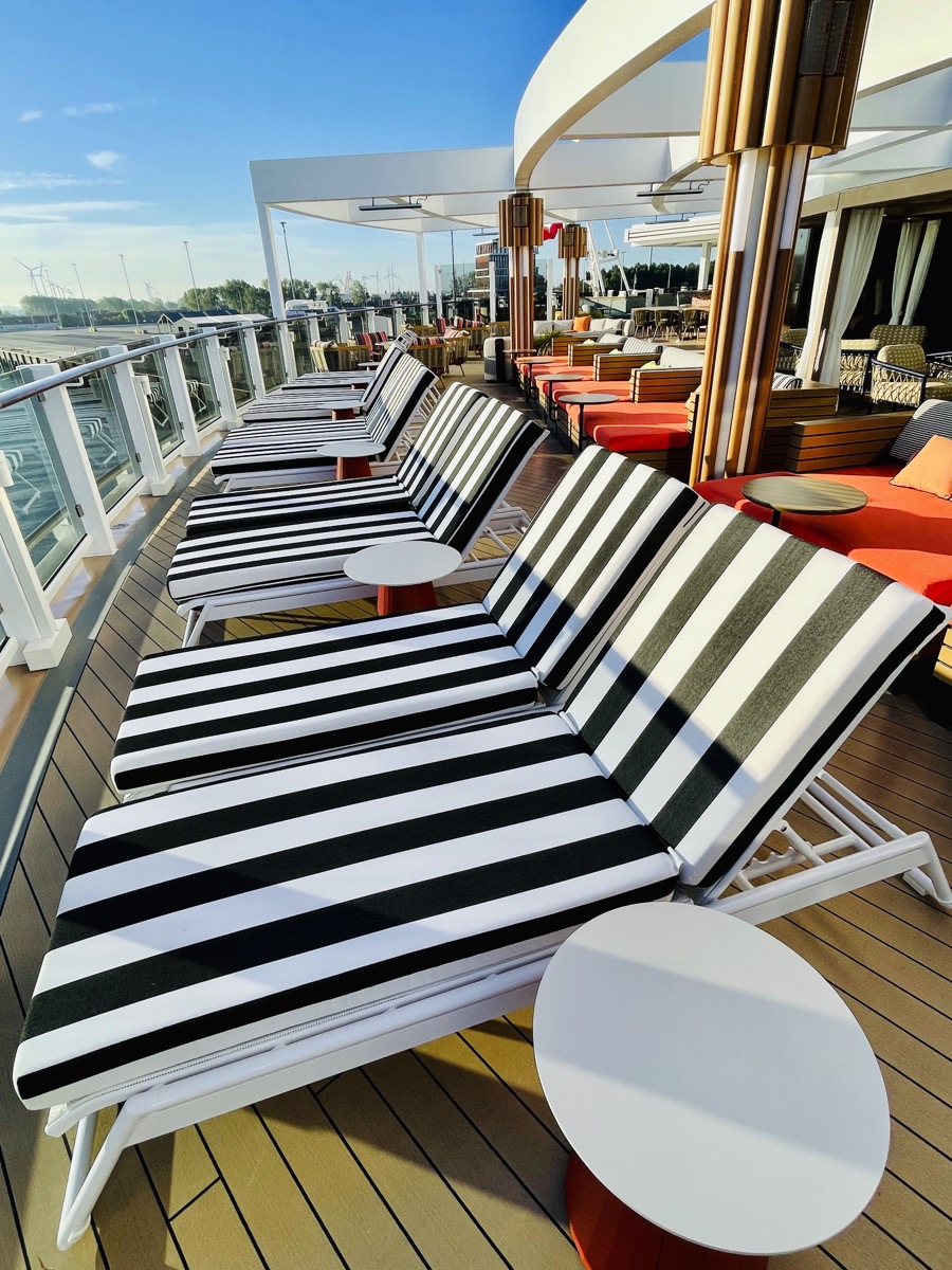 Ontspanning vind je uiteraard ook in de mooie zwembaden, die stijlvoller dan ooit zijn. Op dek 17 ligt het pool dek met het enige echte zwembad. Deze doet overigens wat minder ruim aan, tussen de kartbaan en andere zonnedekken in. Aan beide zijden van het zwembadgebied vind je twee hottubs. De ligbedden, met handige tafeltjes, zijn erg comfortabel maar het zijn er hier niet veel. De rederij probeert op dit schip de gebieden wat kleiner te houden, en de overige ligbedden liggen dan ook verspreid over het hele dek. Ga dus zeker op zoek naar waar je het liefste wilt zitten.