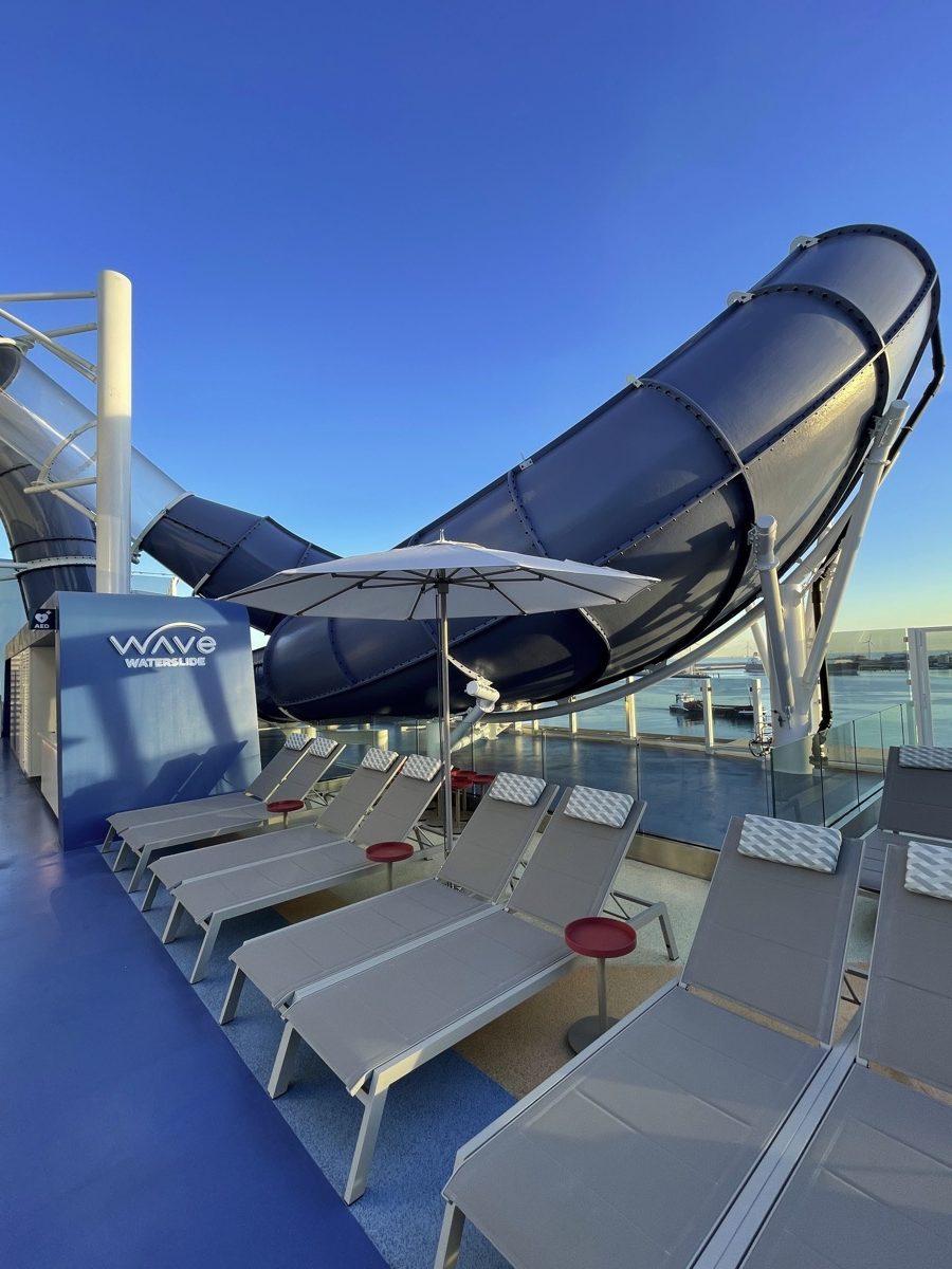 De Norwegian Prima beschikt over een aantal glijbanen, water – en droge glijbanen. De grote waterglijbaan is de Wave glijbaan, waar je met een band (1 of 2 personen) naar beneden glijdt. Wist je dat er bovendien een actiefoto/video gemaakt wordt van je rit?
