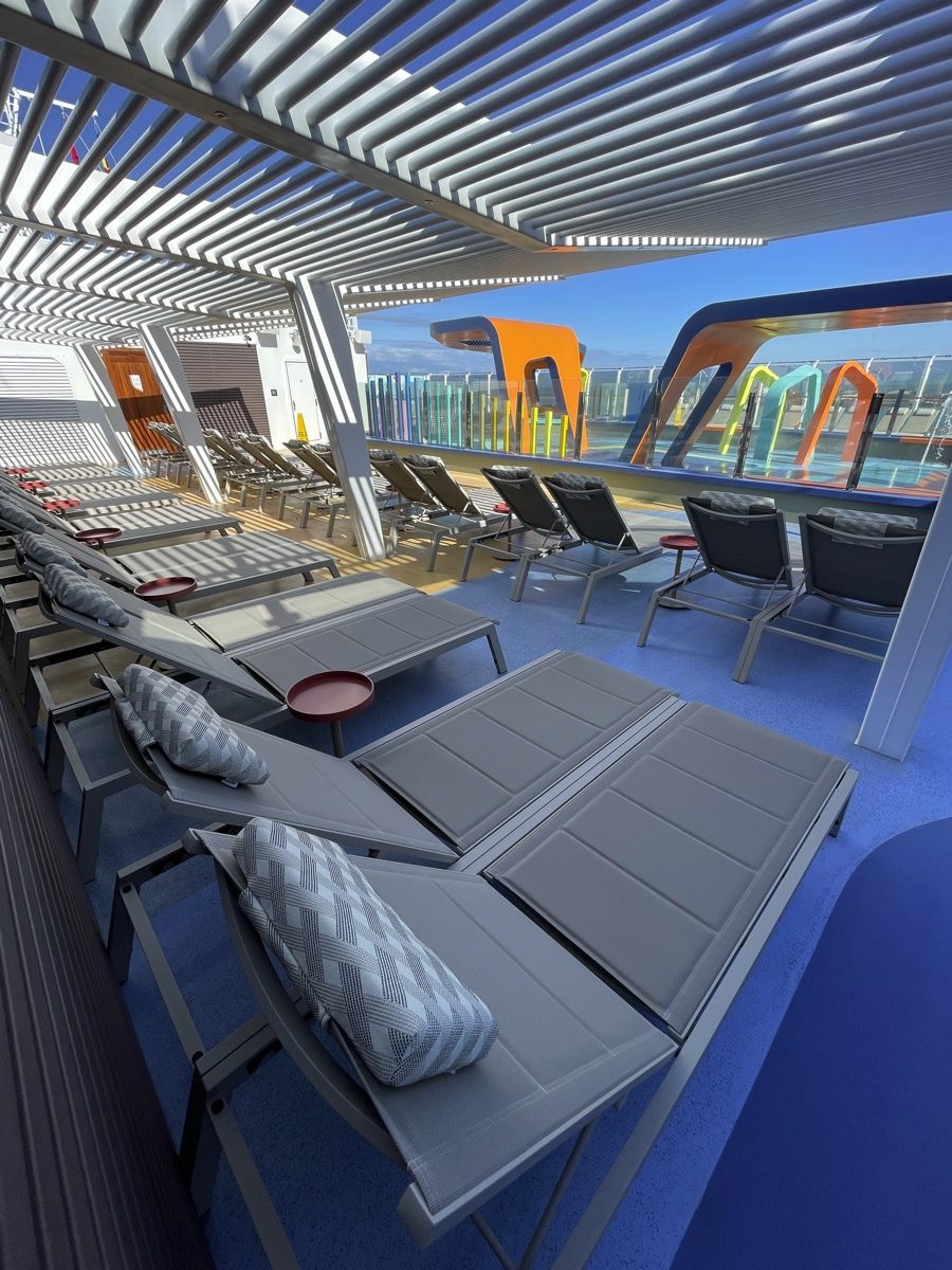 Wil je zonder kinderen zonnen, dan kan je ook een dagpas/weekpas kopen voor de Vibe beach club aan de achterkant van het schip. De mooiste ligbedden en infinity pools liggen in dit gebied dat alleen bestemd is voor 18+. Inclusief zijn overigens verfrissende handdoekjes, fruit, water en een bar waar je drankjes en cocktails kunt bestellen.
