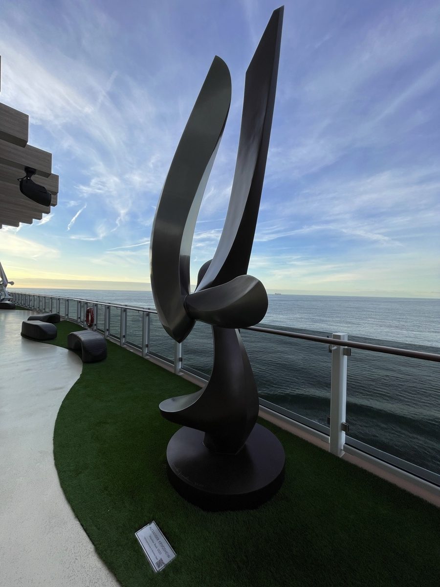 Aan de stuurboordzijde (rechterkant in vaartrichting) ligt een beeldenpark, The Concourse, met mooie beelden van Alexander Krivosheiw.