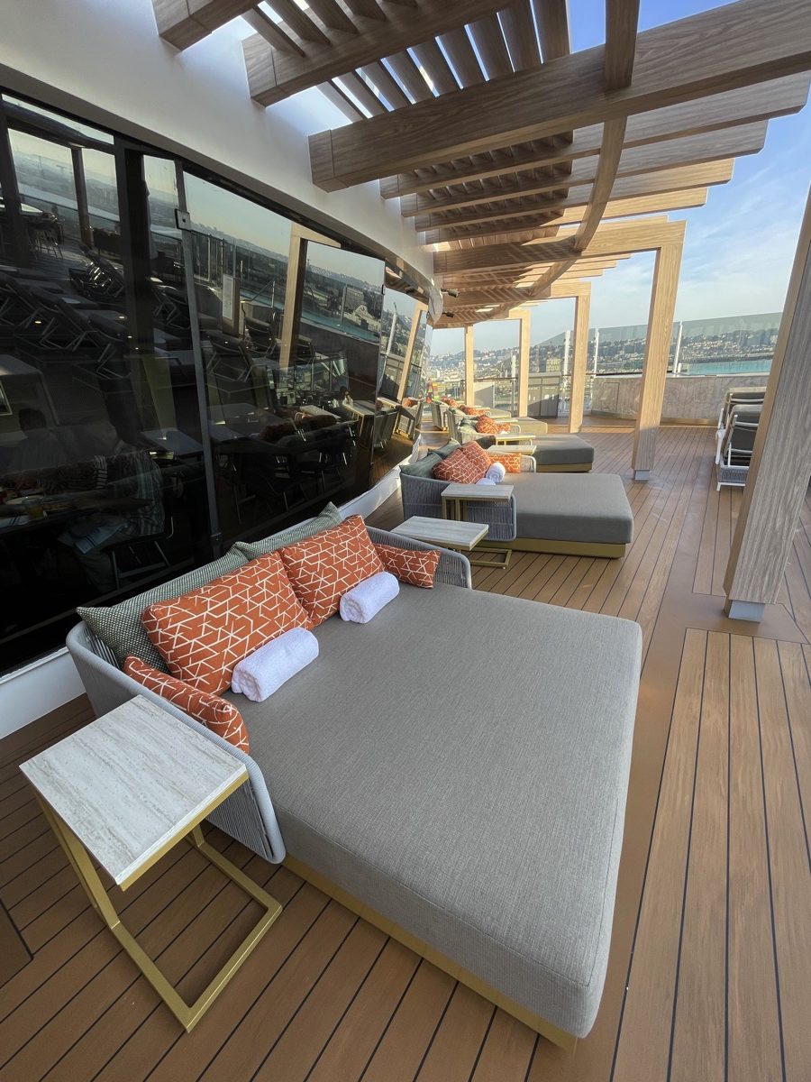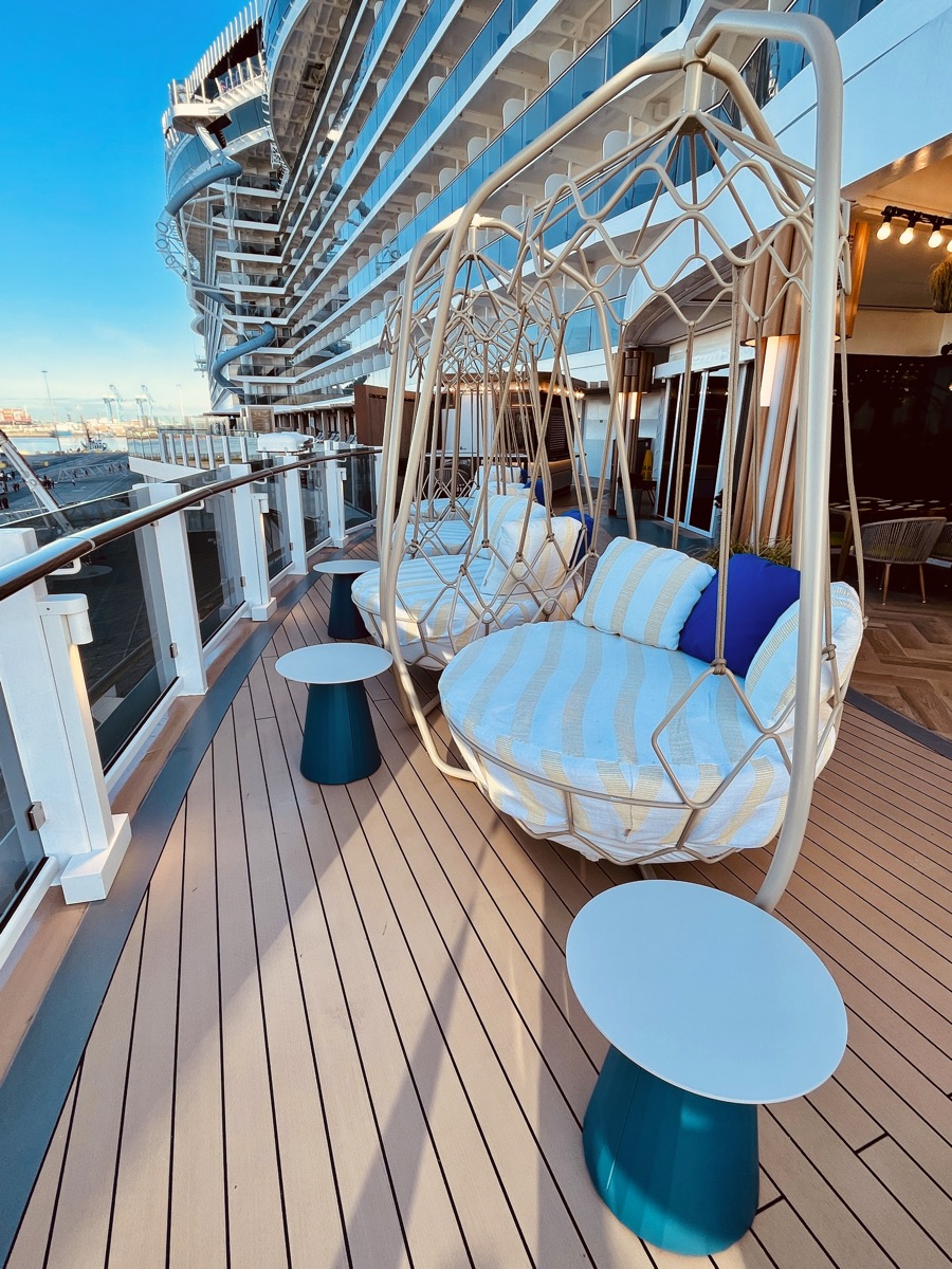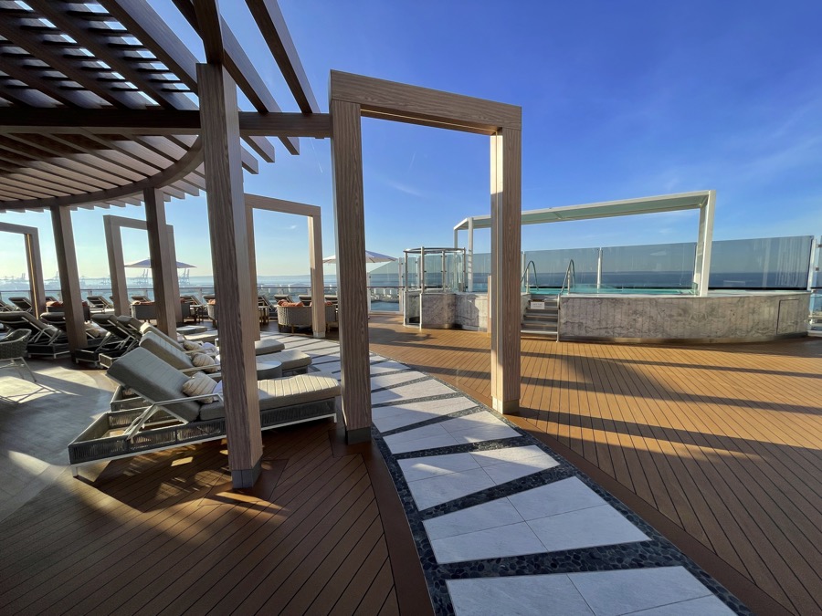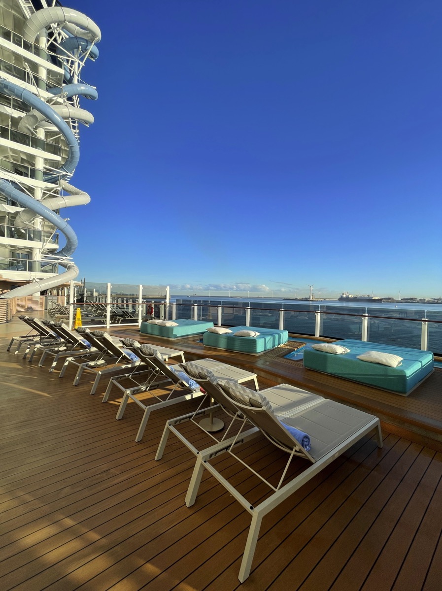 We starten onze tour op dek 8 bij één van de zwembaden, met aan de zijkant enkele tweepersoons bedden. Eromheen een watertje! Dit gedeelte dat Infinity Beach heet, loopt over naar een lounge gebied aan de achterkant van het schip.