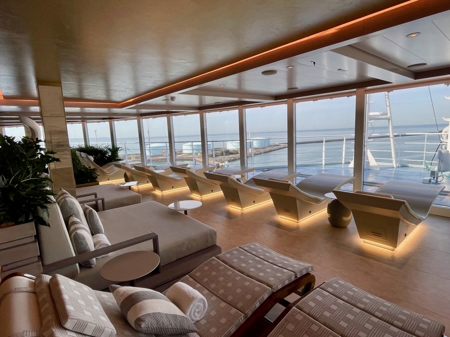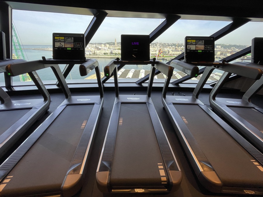 Tot slot vind je een dek hoger de fitness met o.a. een aparte ruimte voor spinninglessen en eentje voor groepslessen zoals yoga. Handig is dat je water kunt tappen en er koude handdoekjes klaarliggen ter afkoeling.