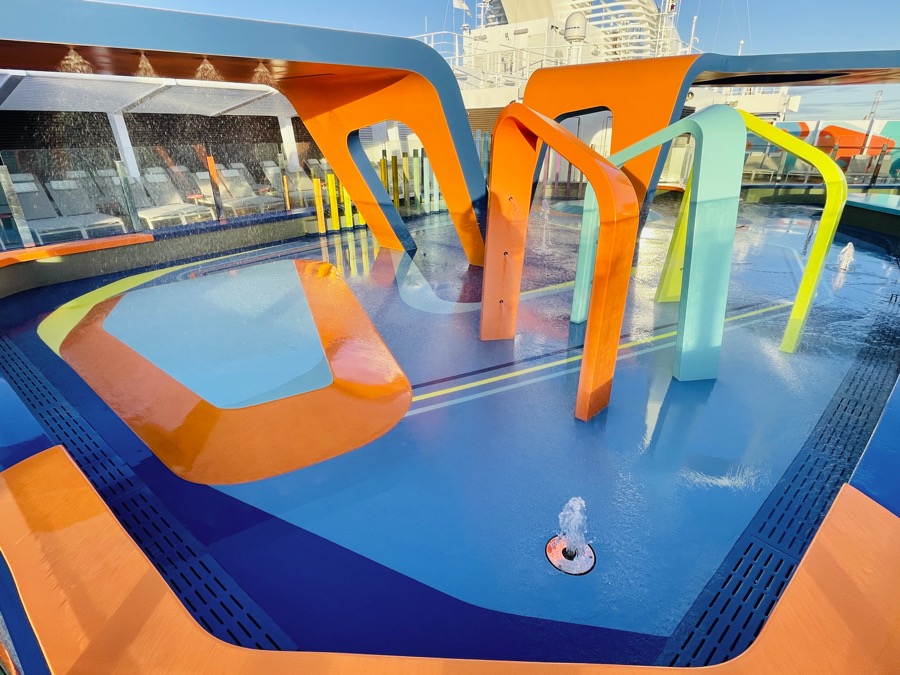 Kinderen hebben een eigen gedeelte op Norwegian Prima met waterspuiten en waterspelen, echt wel voor de wat kleinere kinderen. Ouders kunnen rondom zitten en hun spulletjes kwijt bij de ligbedden, terwijl hun kroost zich vermaakt.