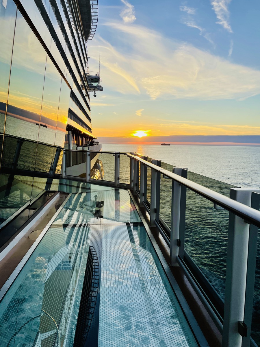 Loop je naar de voorkant dan kom je aan beide zijden de glazen brug, de Ocean Walk tegen, waar je de zee onder je voeten ziet. Op de banken kan je met een cocktail in de hand genieten van de ondergaande zon. Tussen de banken staan verrekijkers om het passerende landschap in detail te bekijken.