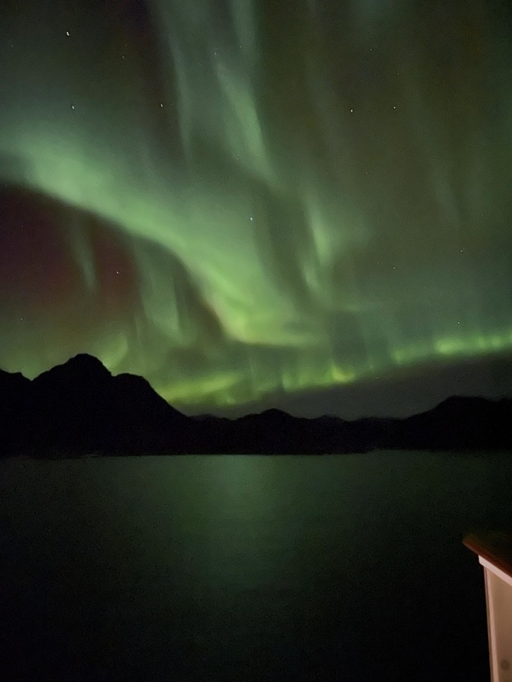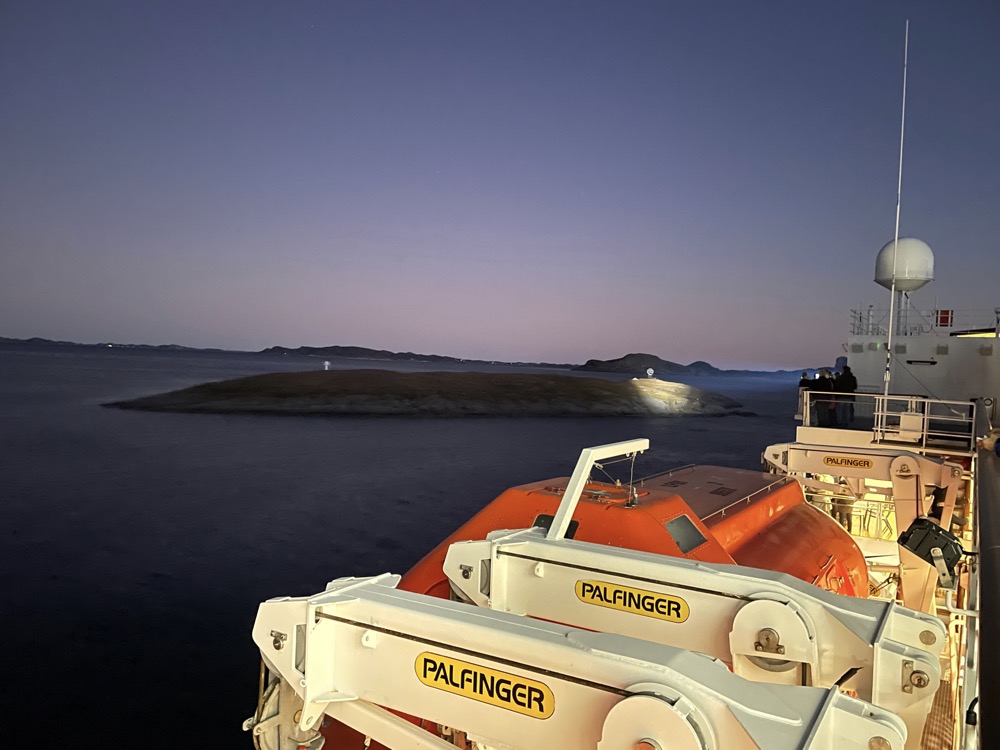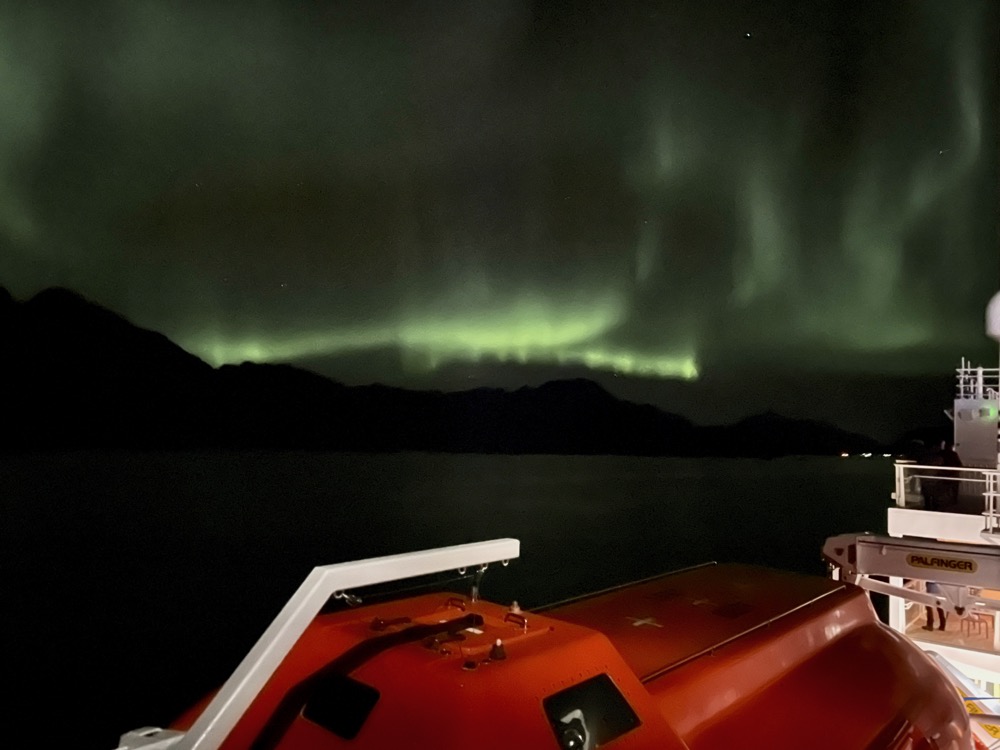 Het was overigens vannacht extreem rustig weer en onbewolkt, wat ervoor zorgde dat we gisteravond zeer laat nog het Noorderlicht konden zien. We werden inderdaad geïnformeerd via de omroep, die ik in mijn hut aan had gezet. Ook zag ik op mijn tv, op de boegcamera, het Noorderlicht verschijnen. Het Noorderlicht was nog niet groots aanwezig, maar kleine plukken die door de lucht heen dansten.